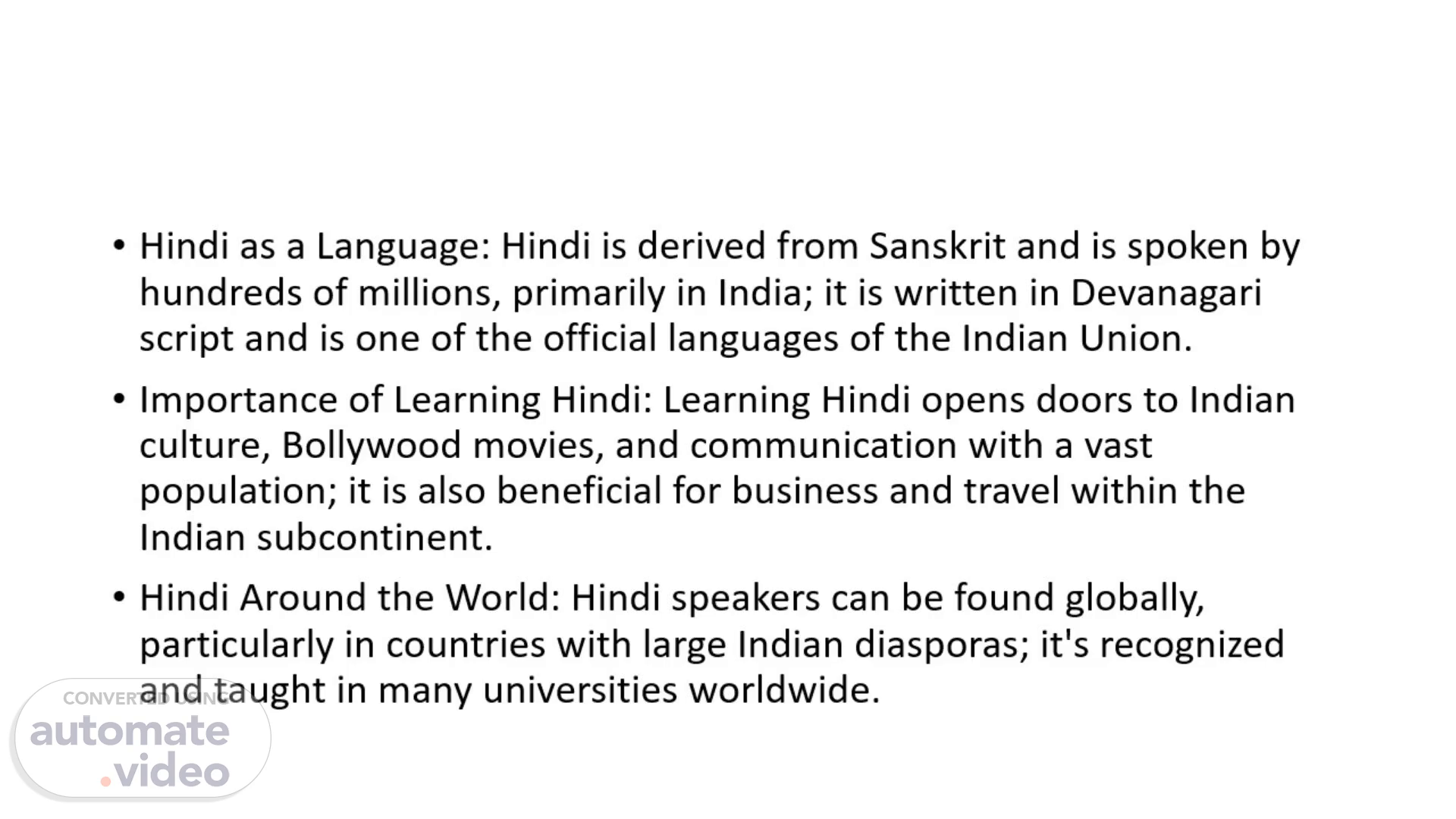 [Audio] Hindi as a Language: Hindi is derived from Sanskrit and is spoken by hundreds of millions, primarily in India; it is written in Devanagari script and is one of the official languages of the Indian Union. Importance of Learning Hindi: Learning Hindi opens doors to Indian culture, Bollywood movies, and communication with a vast population; it is also beneficial for business and travel within the Indian subcontinent. Hindi Around the World: Hindi speakers can be found globally, particularly in countries with large Indian diasporas; it's recognized and taught in many universities worldwide. Hindi as a Language: Hindi is derived from Sanskrit and is spoken by hundreds of millions, primarily in India; it is written in Devanagari script and is one of the official languages of the Indian Union. Importance of Learning Hindi: Learning Hindi opens doors to Indian culture, Bollywood movies, and communication with a vast population; it is also beneficial for business and travel within the Indian subcontinent. Hindi Around the World: Hindi speakers can be found globally, particularly in countries with large Indian diasporas; it's recognized and taught in many universities worldwide..
