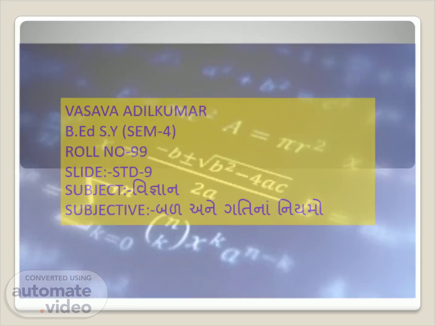 VASAVA ADILKUMAR B.Ed S.Y ( SEM-4) ROLL NO-99 SLIDE:- STD-9 SUBJECT :- વિજ્ઞાન SUBJECTIVE :- બળ અને ગતિનાં નિયમો.