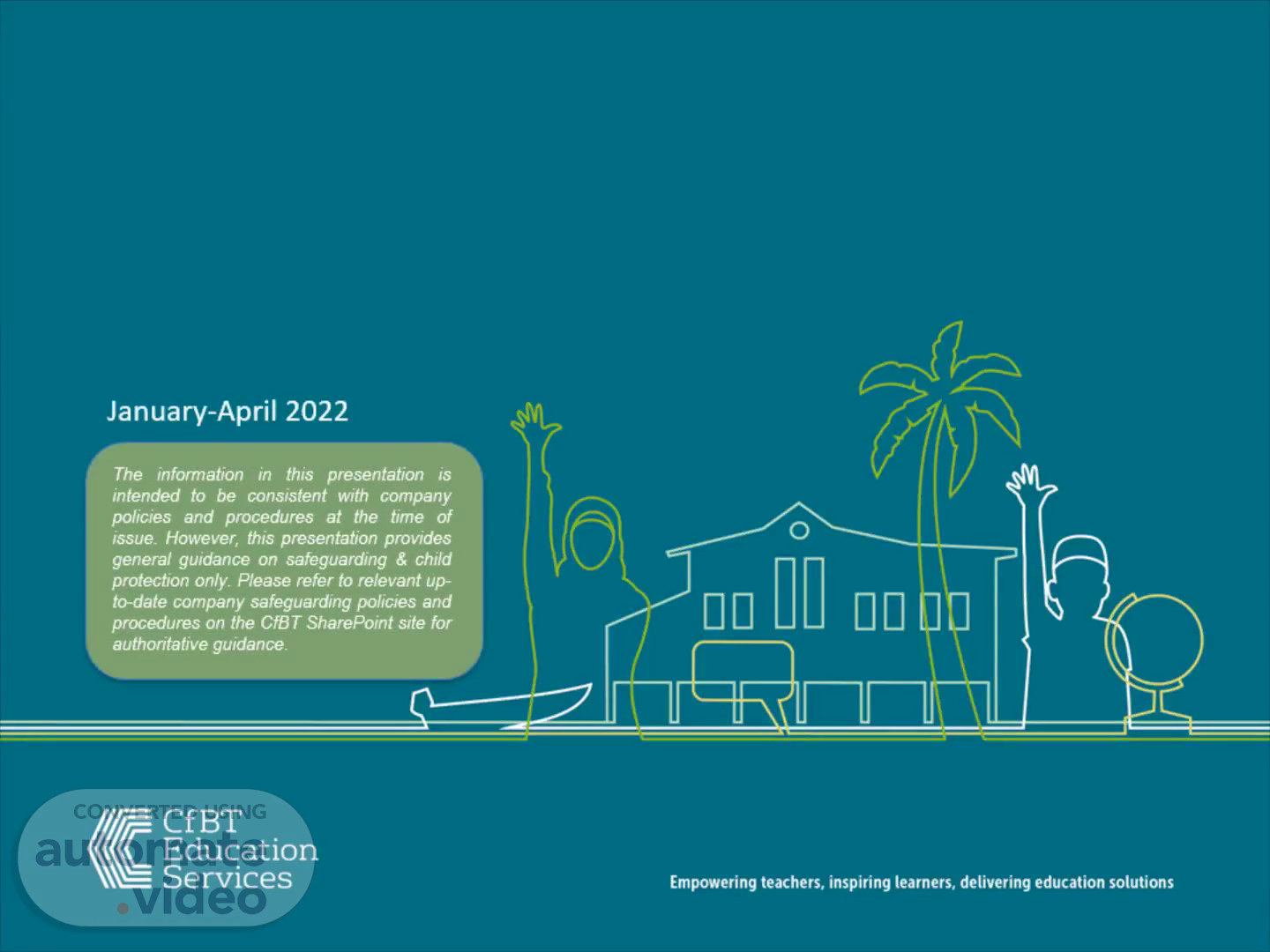 [Audio] Welcome to our CfBT driving in Brunei session. The information in this video* is intended to be consistent with company policies and procedures at the time of issue. However, this presentation provides general guidance on safeguarding & child protection only. Please refer to relevant up-to-date company safeguarding policies and procedures on the CfBT SharePoint site for authoritative guidance..