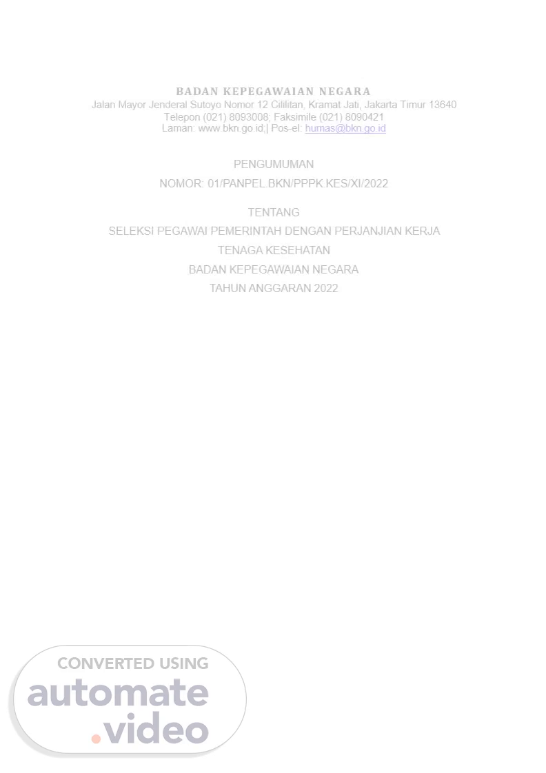 BADAN KEPEGAWAIAN NEGARA Jalan Mayor Jenderal Sutoyo Nomor 12 Cililitan, Kramat Jati, Jakarta Timur 13640 Telepon (021) 8093008; Faksimile (021) 8090421 Laman: www.bkn.go.id;| Pos-el: [email protected] PENGUMUMAN NOMOR: 01/PANPEL.BKN/PPPK.KES/XI/2022 TENTANG SELEKSI PEGAWAI PEMERINTAH DENGAN PERJANJIAN KERJA TENAGA KESEHATAN BADAN KEPEGAWAIAN NEGARA TAHUN ANGGARAN 2022.