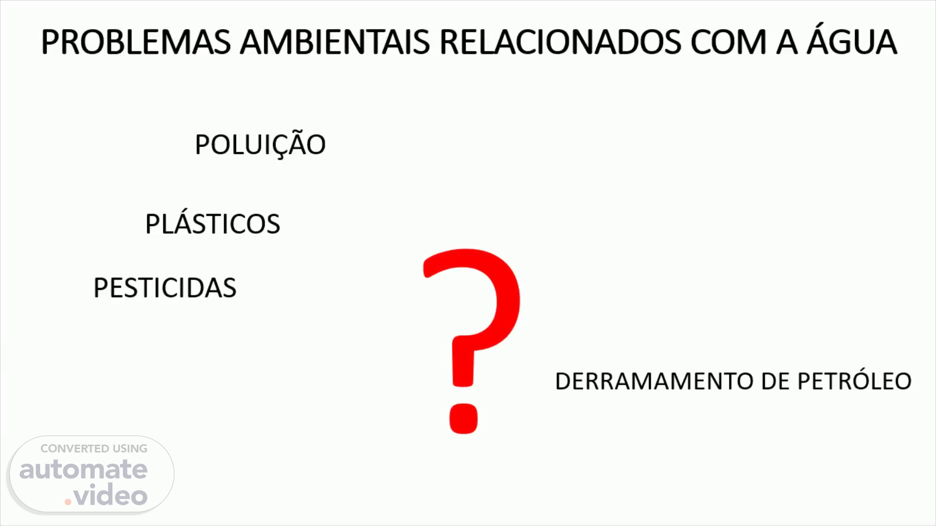 PROBLEMAS AMBIENTAIS. Poluição das águas - Poluição de rios , lagos , mares e oceanos provocada por despejos de esgotos, lixo plástico e acidentes ambientais (derrame de petróleo), etc ;.