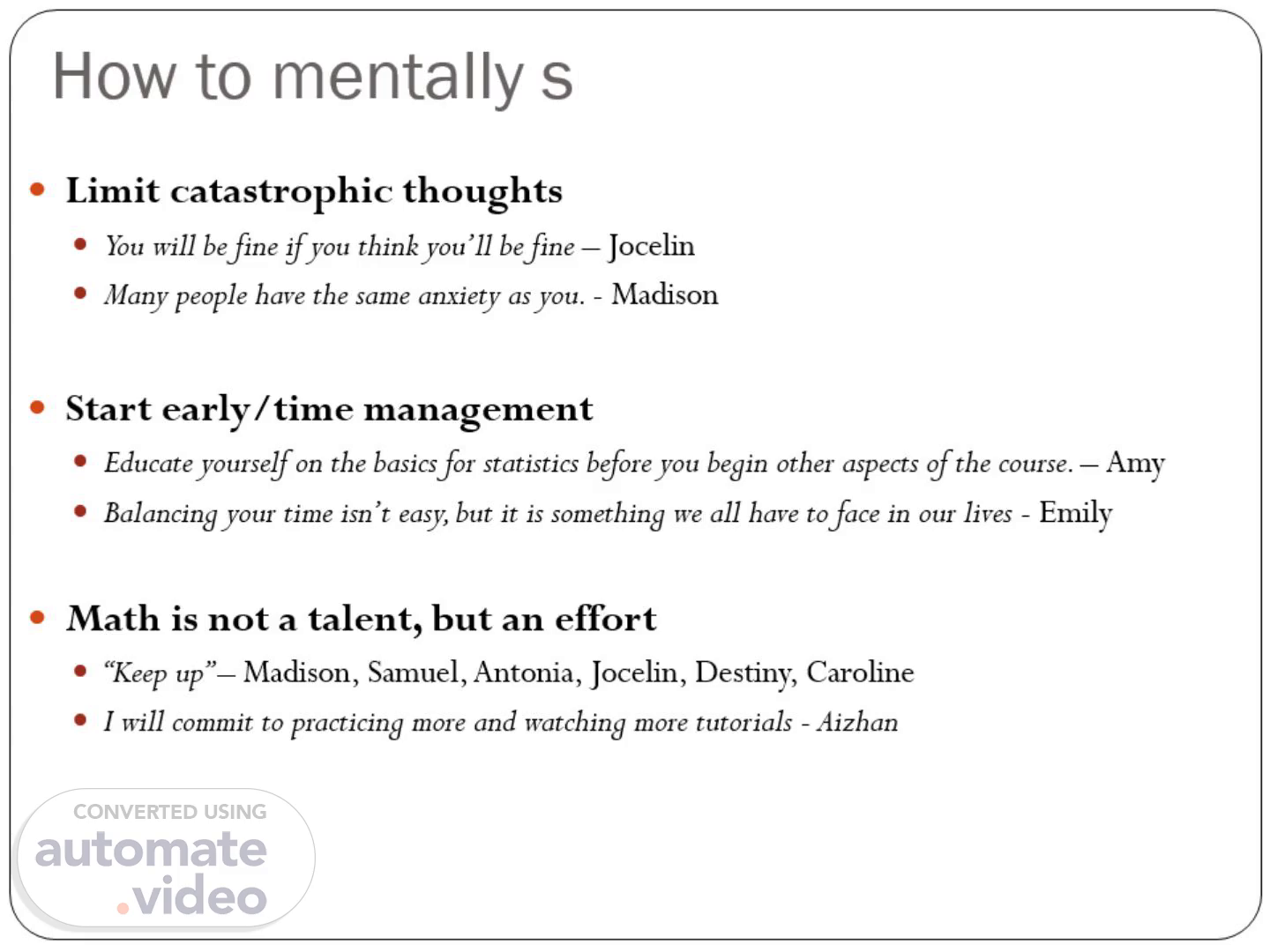 How to mentally succeed in this course.. Limit catastrophic thoughts You will be fine if you think you’ll be fine – Jocelin Many people have the same anxiety as you. - Madison Start early/time management Educate yourself on the basics for statistics before you begin other aspects of the course. – Amy Balancing your time isn’t easy, but it is something we all have to face in our lives - Emily Math is not a talent, but an effort “Keep up” – Madison, Samuel, Antonia, Jocelin, Destiny, Caroline I will commit to practicing more and watching more tutorials - Aizhan.