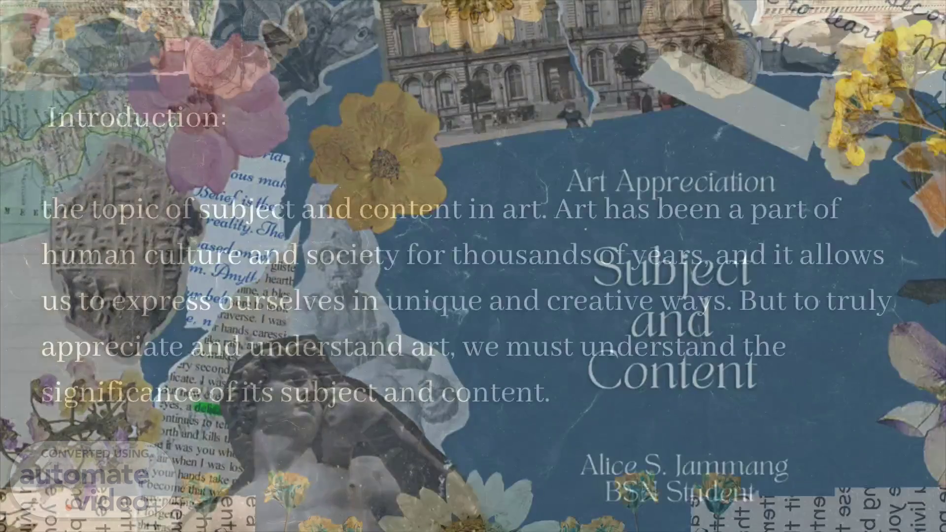 5iuiJ% ous tefis (he pea /z7y. on to/ staverse. I was gr hands xares like .ce makg Cty •licate. -yes, ade »ntinqés te you wh '+flr when I was los Say,' your hands take it become that any pukin r forget t Art Appreciation Subject and Content Alice S. Jammang BSN Student.