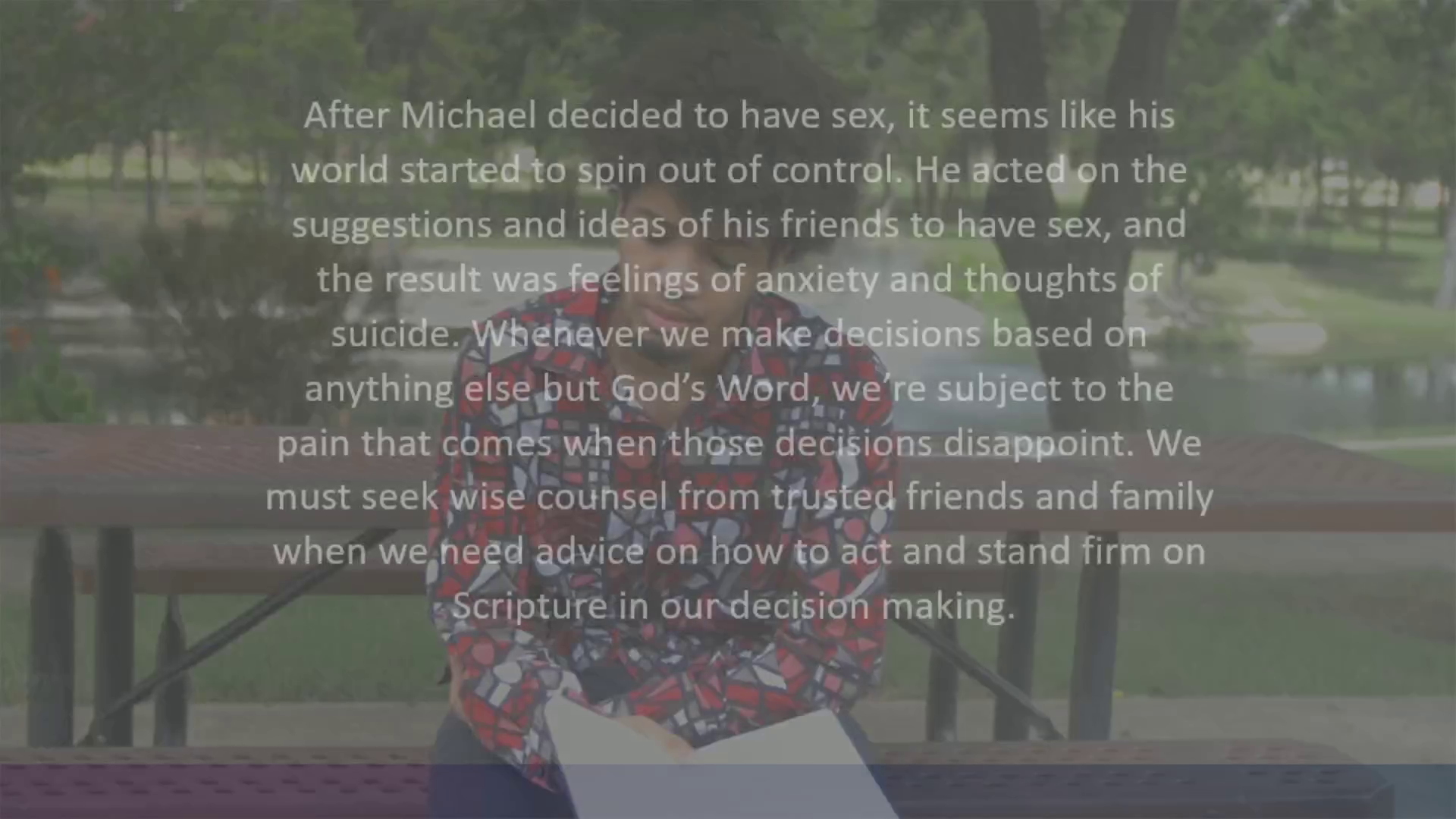 [Virtual Presenter] • After Michael decided to have sex, it seems like his world started to spin out of control. He acted on the suggestions and ideas of his friends to have sex, and the result was feelings of anxiety and thoughts of suicide. Whenever we make decisions based on anything else but God’s Word, we’re subject to the pain that comes when those decisions disappoint. We must seek wise counsel from trusted friends and family when we need advice on how to act and stand firm on Scripture in our decision making..