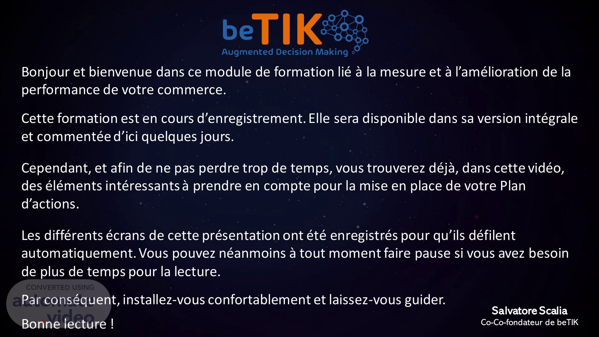 Salvatore Scalia Co-Co-fondateur de beTIK Bonjour et bienvenue dans ce module de formation lié à la mesure et à l’amélioration de la performance de votre commerce. Cette formation est en cours d’enregistrement. Elle sera disponible dans sa version intégrale et commentée d’ici quelques jours. Cependant, et afin de ne pas perdre trop de temps, vous trouverez déjà, dans cette vidéo, des éléments intéressants à prendre en compte pour la mise en place de votre Plan d’actions. Les différents écrans de cette présentation ont été enregistrés pour qu’ils défilent automatiquement. Vous pouvez néanmoins à tout moment faire pause si vous avez besoin de plus de temps pour la lecture. Par conséquent, installez-vous confortablement et laissez-vous guider. Bonne lecture !.