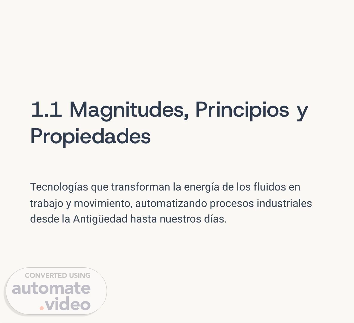 1.1 Magnitudes, Principios y Propiedades Tecnologías que transforman la energía de los fluidos en trabajo y movimiento, automatizando procesos industriales desde la Antigüedad hasta nuestros días..