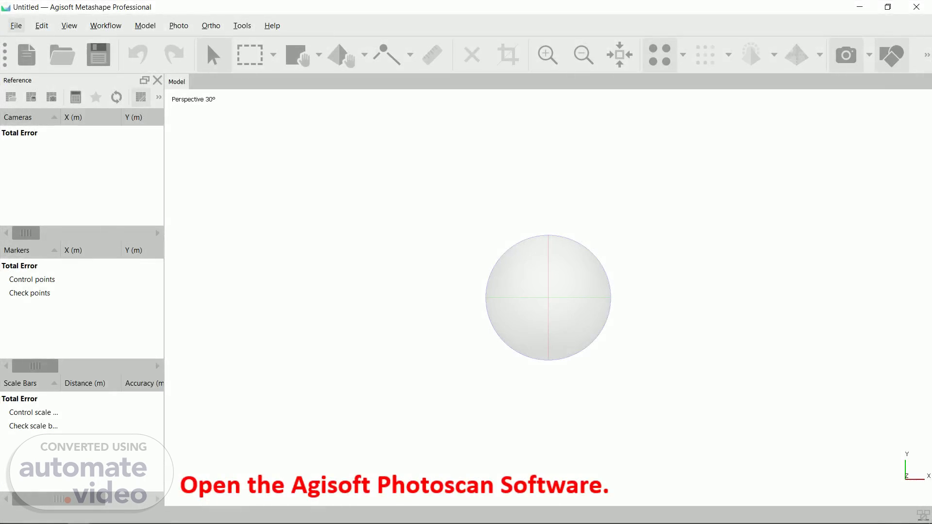 Untitled Agisoft Metashape Professional x File Reference Edit View Workflow Model Add Photos... Add Folderm Align Photos... Photo Ortho 1001s Help Cameras Total Error Markers Total Error Control points Check points Scale Bars Total Error Control scale Check scale b... Distance (m) Build Dense Cloud.. Build Mesh.. Build Texture... Build Tiled Model. Build DEM. Build Orthomosaic.. Align Chunks.. Merge Chunks.. Batch Process... Accuracy ( Load additional photos.