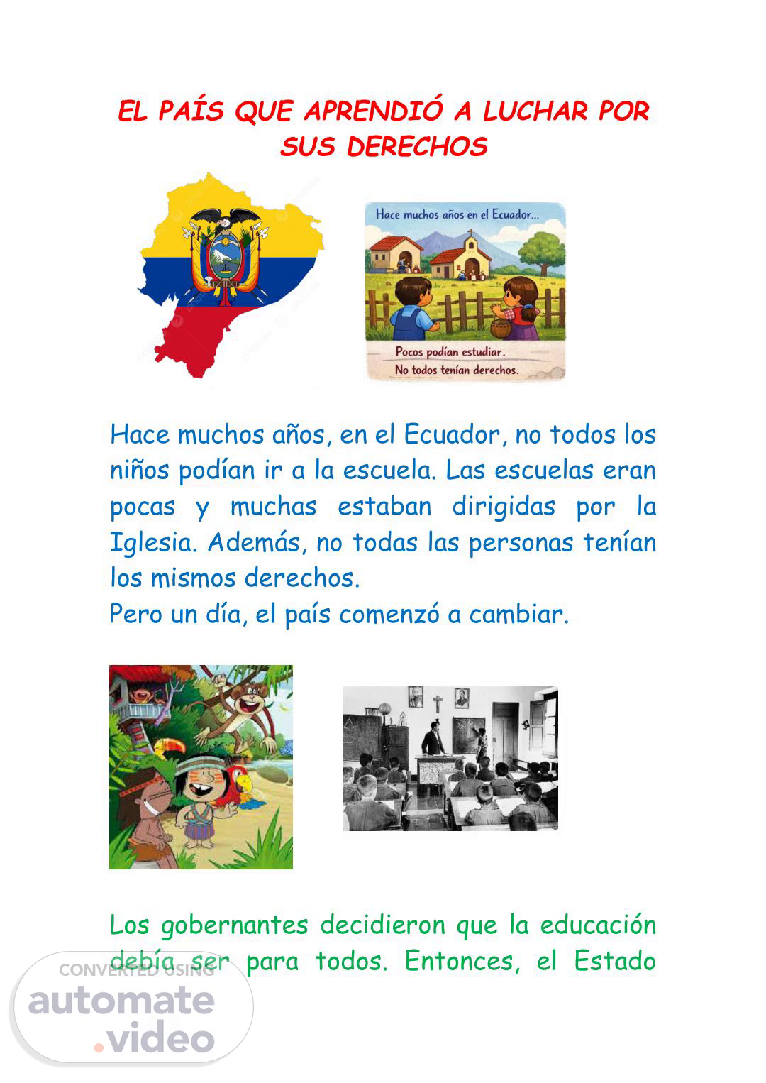 [Audio] EL PAÍS QUE APRENDIÓ A LUCHAR POR SUS DERECHOS Hace muchos años, en el Ecuador, no todos los niños podían ir a la escuela. Las escuelas eran pocas y muchas estaban dirigidas por la Iglesia. Además, no todas las personas tenían los mismos derechos. Pero un día, el país comenzó a cambiar. Los gobernantes decidieron que la educación debía ser para todos. Entonces, el Estado.