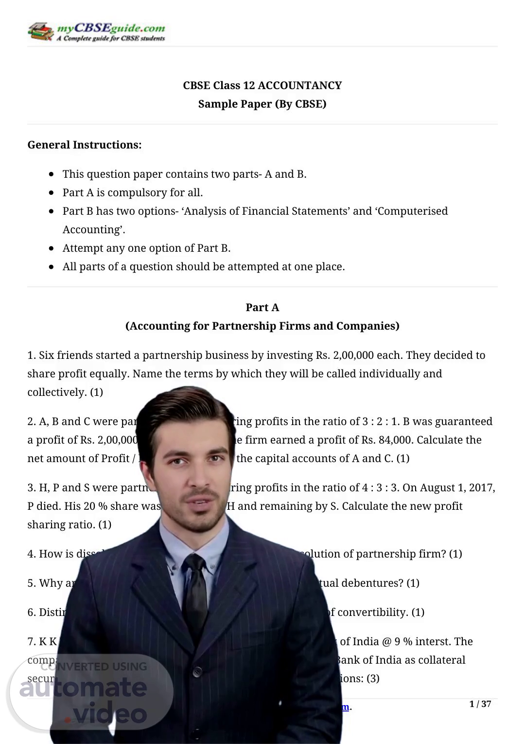 [Virtual Presenter] Welcome to the training video for CBSE Class 12 Accountancy. This presentation aims to provide students with a sample paper to assist them in preparing for their upcoming exams. The presentation will be divided into two parts, Part A and Part B, with Part A being mandatory for all students. Part B offers a choice between two options, 'Analysis of Financial Statements' and 'Computerised Accounting'. It is important to note that students only need to attempt one option in Part B and should answer all parts of a question in one place. Now, let's focus on Part A, which covers Accounting for Partnership Firms and Companies. This section will cover various topics such as terminology used for individual and collective partners, guaranteed profits, and the treatment of a partner's death in the profit sharing ratio. We will also discuss the differences between dissolution of partnership and dissolution of partnership firm, as well as the concept of irredeemable or perpetual debentures. Additionally, we will explore the distinctions between shares and debentures based on their convertibility. To solidify these concepts, we will provide a practical example involving the issuance of debentures in exchange for a bank loan. By the end of the presentation, you will have a better understanding of the key concepts covered in Part A. Thank you for joining us for this training video. We hope it will aid in your preparation for the CBSE Class 12 Accountancy exam. Please continue with the remaining slides to complete the full presentation. Remember, practice makes perfect. Best of luck!.