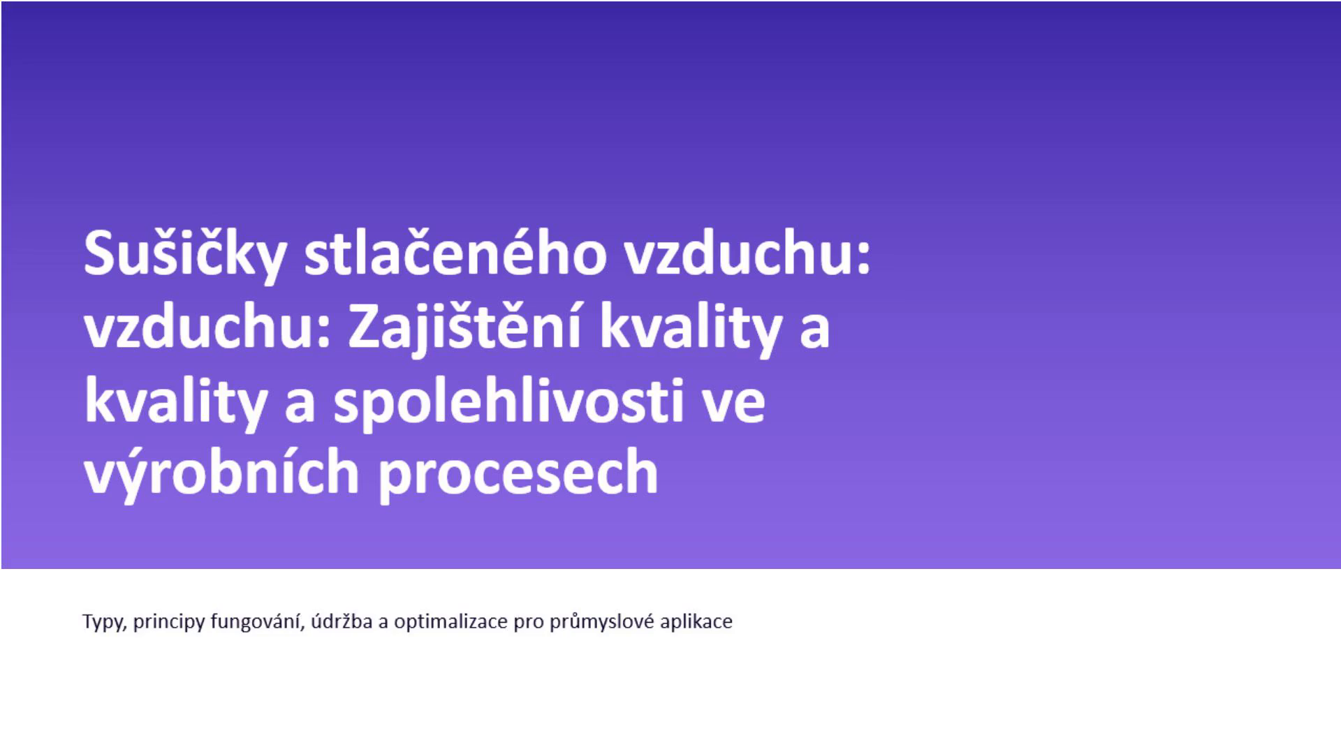 [Audio] Prezentace vznikla ve spolupráci s laboratoří KVALIFIKACE-VALIDACE. Laboratoř KVALIFIKACE-VALIDACE provádí zkoušky kvality stlačeného vzduchu podle normy ISO 8573. Více informací o termických procesech naleznete na stránkách: https://kvalifikace-validace.cz/iso-8573-1/.