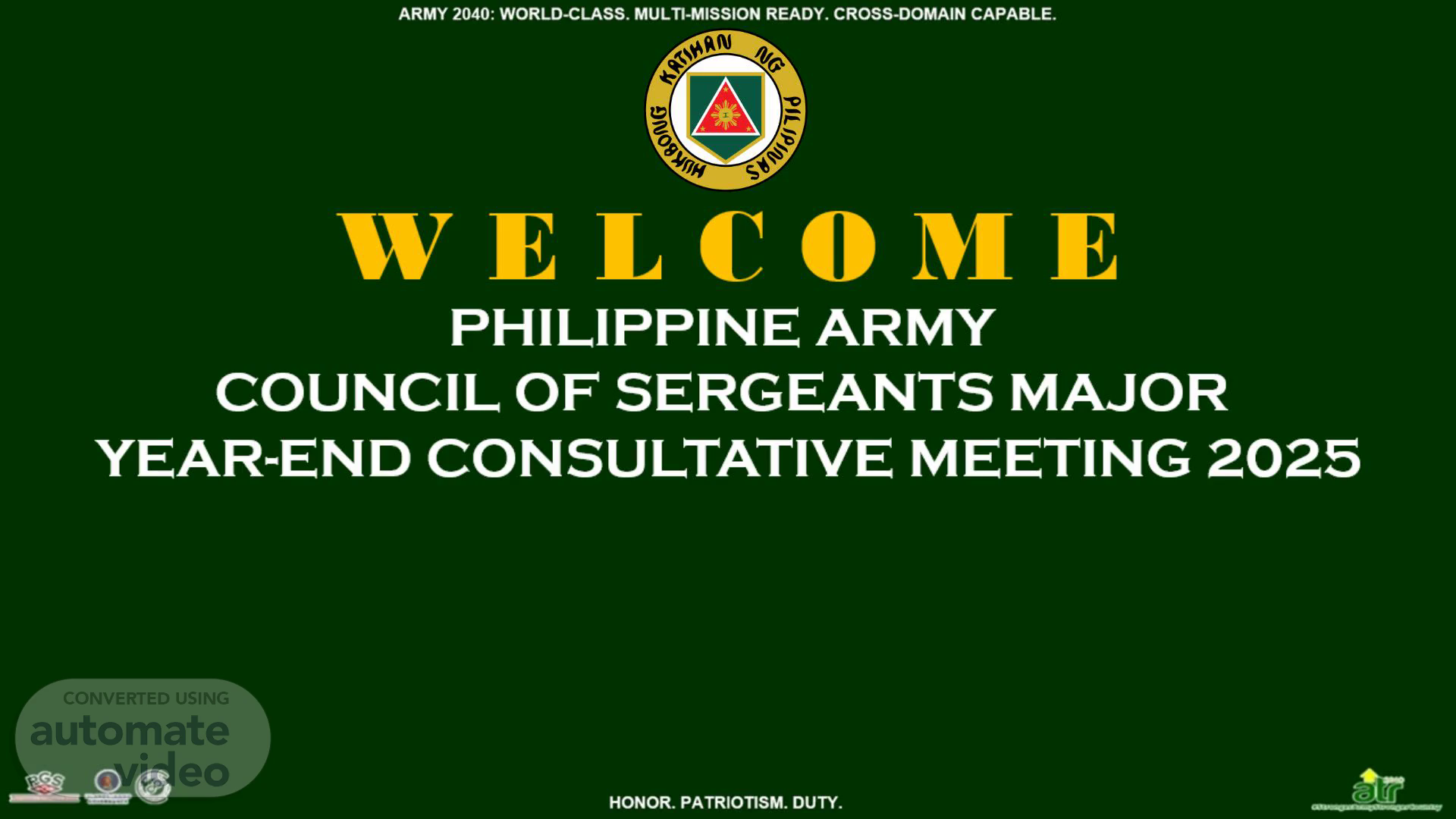 [Audio] To our Guest of Honor and Speaker, our Commanding General, Philippine Army, LTGEN ANTONIO G NAFARRETE PA, whom I introduce later, good afternoon, Sir. To the Chief, Chaplain, Philippine Army, COL ROY L ONGGAO CHS (GSC) PA; the Assistant Sergeant Major, Philippine Army, CMS Dyzxver V Melgar (MI) PA; all Philippine Army Sergeants Major physically and virtually present, good afternoon. It is distinct honor to welcome all of you for the Closing Ceremony of the Philippine Army Council of Sergeants Major Year-End Consultative Meeting 2025 in conjunction with the 30th Philippine Army Non-Commissioned Officer Week Celebration, we welcome all the participants of this activity and I would like to thank our Commanding General, Philippine Army, LTGEN ANTONIO G NAFARRETE PA, for the honor of his presence today. The 2-day activity of Philippine Army Council of Sergeants Major Year-End Consultative Meeting 2025 in conjunction with the 30th Philippine Army Non-Commissioned Officer Week Celebration was met. With this activity, the Office of the Army Sergeant Major through the Philippine Army Non-Commissioned Officer Council in collaboration with the Office of the Assistant Chief of Staff for Personnel, OG1, PA; and the Office of the Financial Management, OG10, PA had imparted to the participants the knowledge of our Resource Speakers/Subject Matter Experts. To the participants of Philippine Army Council of Sergeants Major Year-End Consultative Meeting 2025 in conjunction with the 30th Philippine Army Non-Commissioned Officer Week Celebration, welcome and good afternoon to all of you… As the Army Sergeant Major. It is my honor to present to our Guest of Honor and Speaker the Synopsis of the Philippine Army Council of Sergeants Major Year-End Consultative Meeting 2025 in conjunction with the 30th Philippine Army Non-Commissioned Officer Week Celebration from 13 to 15 October 2025 here at Philippine Army Non-Commissioned Officer Clubhouse, Fort Bonifacio, Taguig City..
