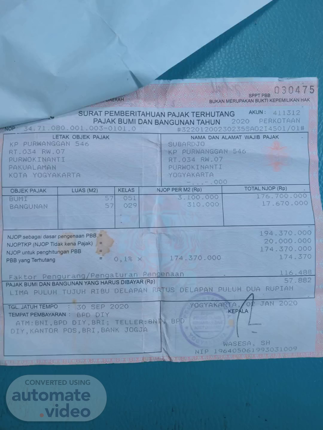 . 0304±5 v sppT PBB BUKAN MERUPAKAN BUKTI KEPEMILIKAN HAK SURAT PEMBERITAHUAN PAJAK TERHUTANG AKUN: 411312 PAJAK BUMI DAN BANGUNAN TAHIJN 2020 PERKOTAAN LETAK OBJEK PAJAK KP PURWANGGAN 546 RTE 034 RVU„07 Pl-JRNOKiNANT1 PAKUALAMAN KOTA YOGYAKARTA NAMA DAN ALAMAT WAJIB PAJAK KP PURINANGGAN 546 RT„034 RW„07 PURWOKINANTI YOGYAKARTA „ooo OBJEK PAJAK BANGUNAN LUAS (M2) KELAS 57 029 NJOP PER M2 (Rp) -ooo TOTAL NJOP (Rp) 176.700 „ooo 17 . 670.000 NJOP sebagai dasar pengenaan PBB NJOPTKP (NJOP Tidak kena Pajak) NJOP untuk penghitungan PBB PBB yang Terhutang 17 4 E Faktor Pen uran Pen at uran Pen e naan PAJAK BUMI DAN BANGUNAN YANG HARUS DIBAYAR (RP) 310.000 370 ooo 20 ooo ooo 370 ooo 174. 370 OOO 1i6.4BB 57 LIMA PULUH TUJIJH RIBU DELAPAN DELAPAN PULUH DUA RUPIAH TGL. JATUH TEMPO TEMPAT PEMBAYARAN • 30 SEP 2020 BPC) 01 Y BPC) 01M, KANTOR POSY8R1„8ANK JOGJA YOGYAKAR A, O JAN 2020 -KEP LA WASESA. SH 196405061 993031009.