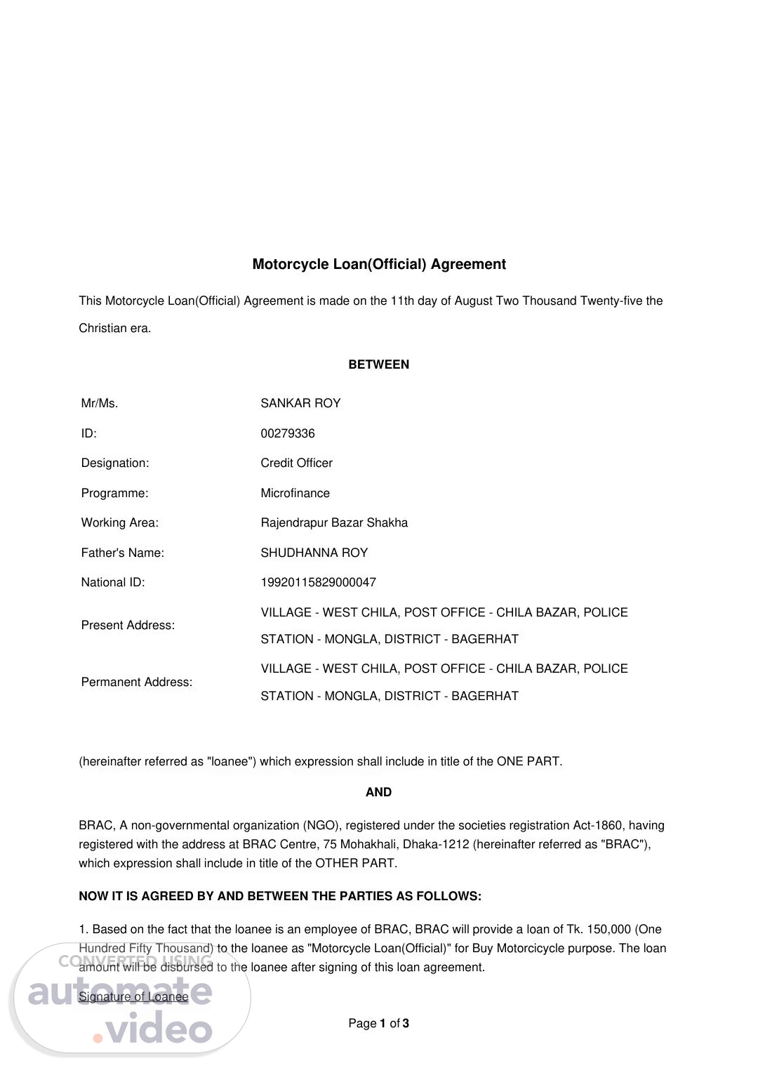 Motorcycle Loan(Official) Agreement This Motorcycle Loan(Official) Agreement is made on the 11th day of August Two Thousand Twenty-five the Christian era. BETWEEN Mr/Ms. SANKAR ROY ID: 00279336 Designation: Credit Officer Programme: Microfinance Working Area: Rajendrapur Bazar Shakha Father's Name: SHUDHANNA ROY National ID: 19920115829000047 Present Address: VILLAGE - WEST CHILA, POST OFFICE - CHILA BAZAR, POLICE STATION - MONGLA, DISTRICT - BAGERHAT Permanent Address: VILLAGE - WEST CHILA, POST OFFICE - CHILA BAZAR, POLICE STATION - MONGLA, DISTRICT - BAGERHAT (hereinafter referred as "loanee") which expression shall include in title of the ONE PART. AND BRAC, A non-governmental organization (NGO), registered under the societies registration Act-1860, having registered with the address at BRAC Centre, 75 Mohakhali, Dhaka-1212 (hereinafter referred as "BRAC"), which expression shall include in title of the OTHER PART. NOW IT IS AGREED BY AND BETWEEN THE PARTIES AS FOLLOWS: 1. Based on the fact that the loanee is an employee of BRAC, BRAC will provide a loan of Tk. 150,000 (One Hundred Fifty Thousand) to the loanee as "Motorcycle Loan(Official)" for Buy Motorcicycle purpose. The loan amount will be disbursed to the loanee after signing of this loan agreement. Signature of Loanee Page 1 of 3.