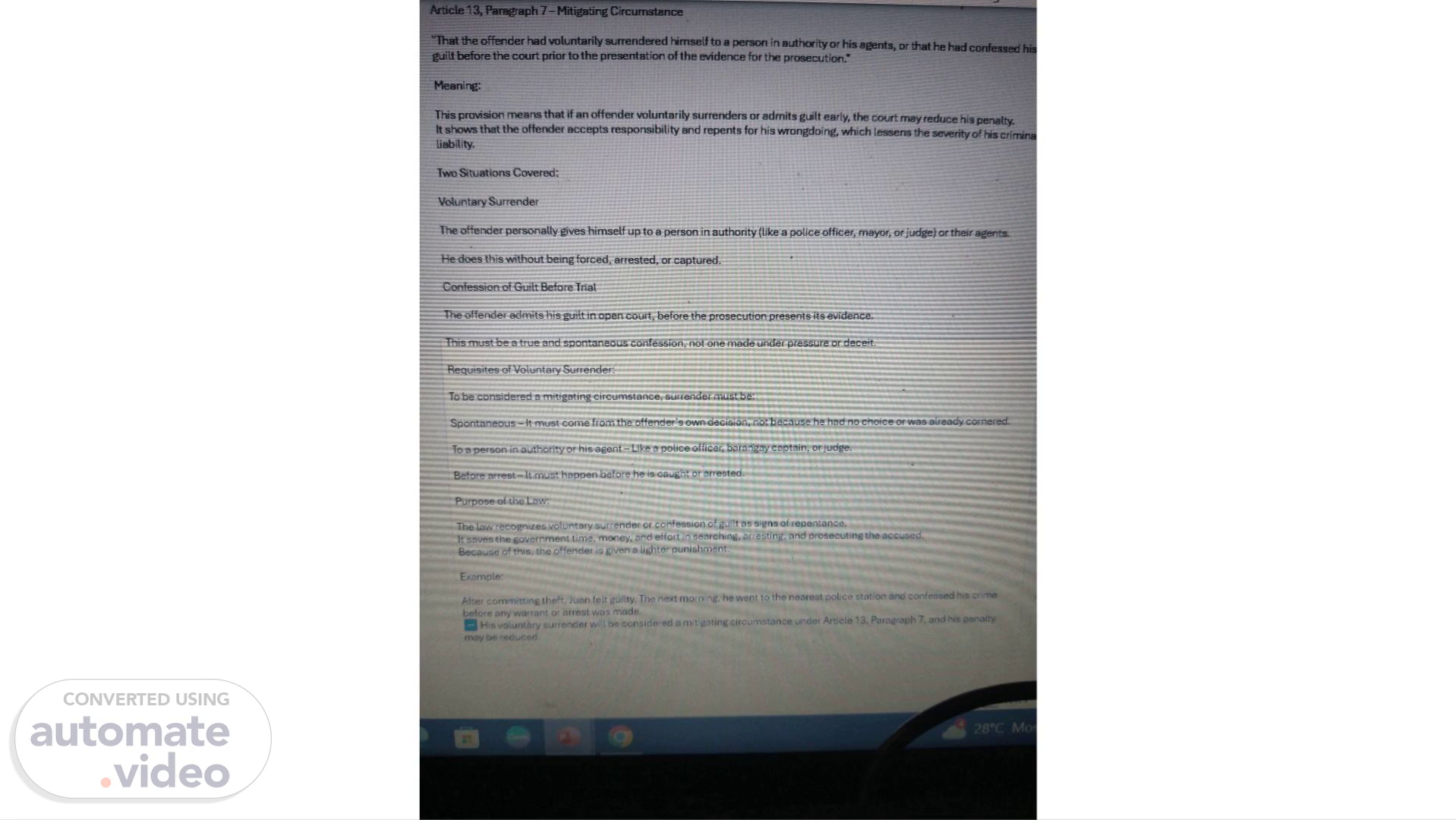 k-ti& 13, •Parvaph MitigBting Circurnstanæ "That fre offH'der iud wluntarity himself to a in Buthxyity or his agents, or that he had guilt the ccurt prior to the of the widence for proæcxtiCY1.• &anirw This provision nwans that if an offender voluntarily surrenders or admits glitt early, the court rnay reduce his penalty It shows that the offer&r responsibility and repents for his wrongdoire, which lessens the severity of his crirrina Two Stuations Wuntary Surrender Tte offender personally gives himself up to a person in authority (like a police officer, mayor, or judge) or their He this without being forced, arrested, or captured. Cafession of Guilt Before Trial The offender admits his guilt in open court, before the prosecution presents its evidence. •TEShiüstbéittüeand spontaneous Confession, not one made undef pressure or deceit. Requisites of Voluntary Surrender: To be considered a mitigating circumstance, surrender must be: Spontaneous —It must come from the offender 's decision, not because he had no choice or was already cornered. To a person in authority or his agent — Like a police officer, baranäay captain, or judge. Before arrest—lt must happen before he is caught or arrested. Purpose of the Law The law recognizes voluntary surrender or confession Of guilt as Of repentance. It saves the government time. rnorey, and effort in searching. arresting, and prosecuting the accused. Because of this, offender is given a lighter punishment. Example • . After cornmiwne theft. Juan felt guilty. The next morning, he went to the nearest police station his crime any o' arrest made. considered m;tieating circumstance under Article 3. Paragraph 7. and his penalt) may oe.