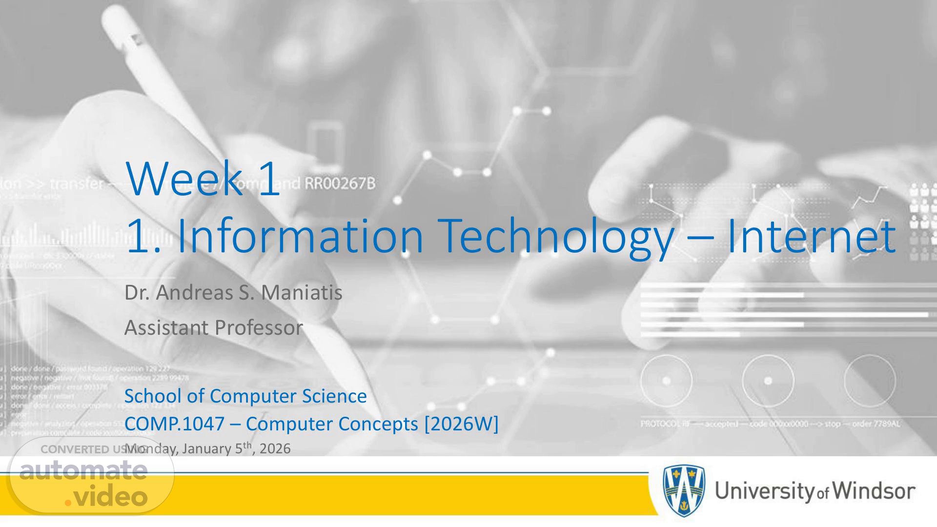 [Audio] Week 1 1. Information Technology – Internet Dr. Andreas S. Maniatis Assistant Professor School of Computer Science COMP.1047 – Computer Concepts [2026W] Monday, January 5th, 2026.