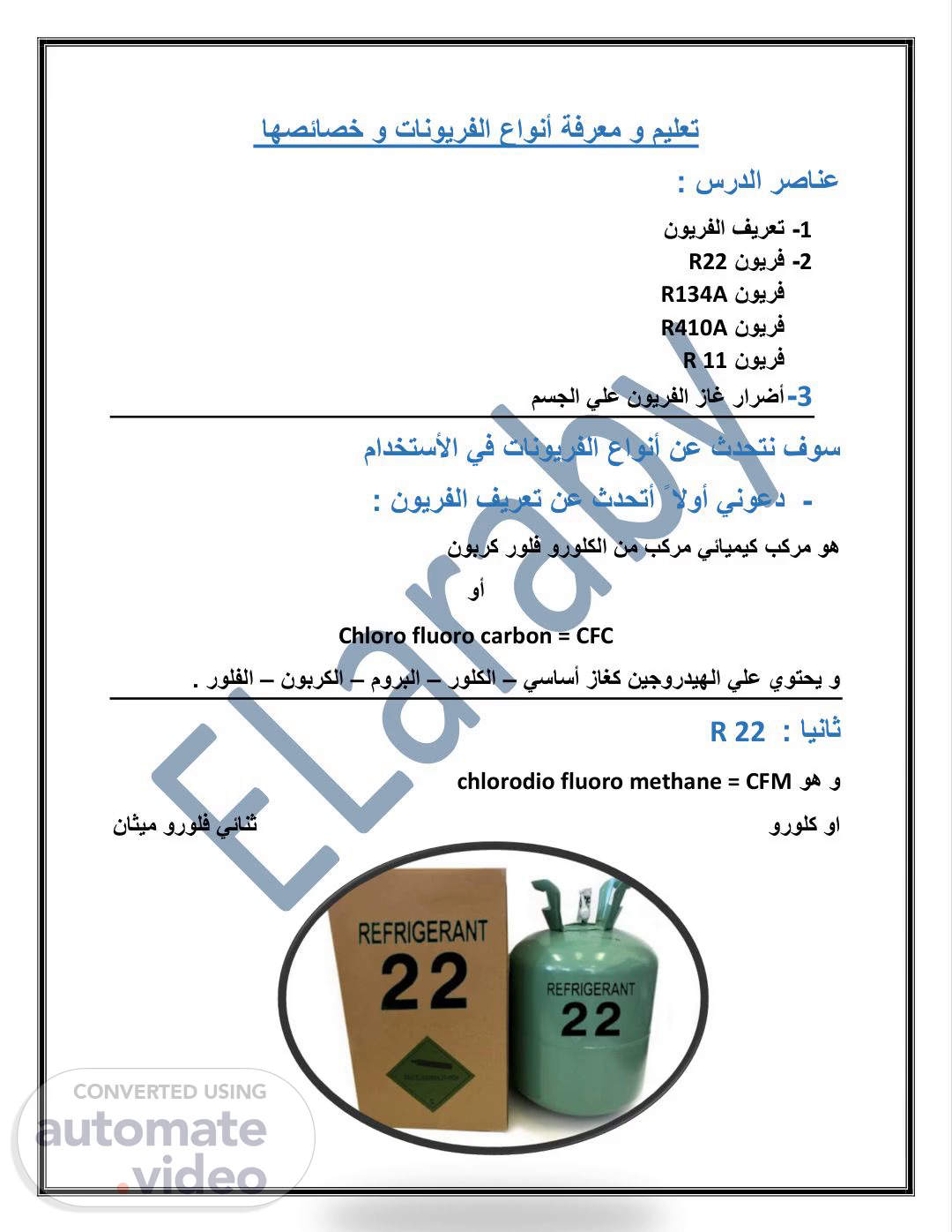 اهصئاصخ و تانويرفلا عاونأ ةفرعم و ميلعت : سردلا رصانع 1- نويرفلا فيرعت 2- نويرف R22 R134A نويرف R410A نويرف R 11 نويرف 3 - مسجلا يلع نويرفلا زاغ رارضأ مادختسلأا يف تانويرفلا عاونأ نع ثدحتن فوس - ينوعدلاوأً : نويرفلا فيرعت نع ثدحتأ بكرم وه نوبرك رولف ورولكلا نم بكرم يئايميك وأ Chloro fluoro carbon = CFC زاغك نيجورديهلا يلع يوتحي ويساسأ – رولكلا– موربلا– نوبركلا– رولفلا. R 22 : ايناث chlorodio fluoro methane = CFM وه و ناثيم ورولف يئانث ورولك وا.