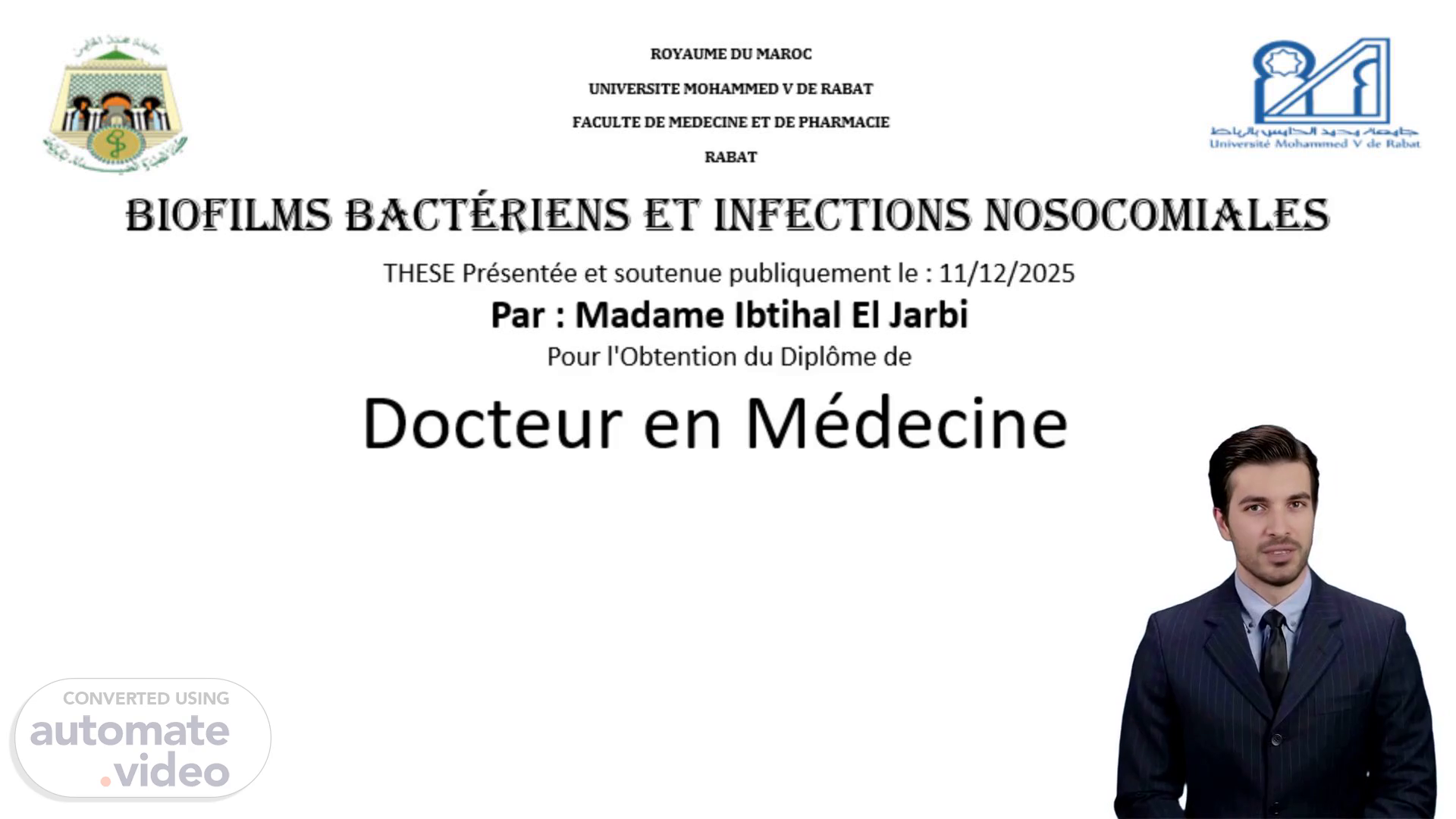 [Virtual Presenter] La titre de cette présentation est "Biofilms Bacteriens et Infections Nosocomiales", qui se traduit par "Biofilms Bactériens et Infections Contractées dans les Hôpitaux". Cette présentation couvrira divers aspects liés aux biofilms bactériens, notamment leur formation, leur structure et leurs fonctions, ainsi que leur rôle dans la cause d'infections contractées dans les hôpitaux. Le locuteur discutera des facteurs influençant la formation des biofilms, tels que les propriétés superficielles, les conditions environnementales et les caractéristiques bactériennes. De plus, la présentation touchera sur l'importance de comprendre les biofilms dans le contexte de la santé publique et de la médecine..