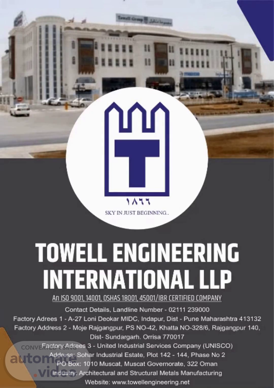 [Audio] We are proud to introduce Towell Engineering International LLP, a certified company in India and Oman. Our specialization lies in architectural and structural metals manufacturing, and we are delighted to offer our services to you. Founded in 2000 by Mr. Balaji Stinivasan, our Group CEO and Managing Director, we have grown into a multinational engineering group with diverse activities. Our services are spread across various businesses, including Towell Infrastructure Projects Co. LLC, United Industrial Services Co. LLC, Towell Drilling & Oilfield Services LLC, Towell Engineering Services Co. LLC, Towell Electrical Projects Co. LLC, Towell Construction Co. LLC, Taylor Woodow Oman, Towell Engineering Group in Qatar, Towell Engineering Group in Kuwait, and NXT LEVVEL FABRICATION facilities. At our state-of-the-art manufacturing plant in Indapur MIDC, Pune, we have an impressive range of advanced technology, such as CNC Cutting machines, CNC Plate Bending machines, Hydraulic Press, Column and Boom, SAW Welding, SMAW, FCAW, MIG, TIG welding, Machining facility, and 64 MT Single Piece Lifting Overhead Cranes. With these resources, we can fabricate close to 2000 metric tons per month in-house, and up to 1000 metric tons per month with the help of our associates, resulting in a total of 3000 metric tons per month. Our second manufacturing unit in Rourkela, Odisha, is also equipped with cutting-edge technology, including CNC plasma cutting machines, and has a capacity of 1,500 metric tons per month. This unit primarily caters to our eastern business verticals. Our capabilities cover a wide range of fabrication, including building, technological, super structures, and ducting. Additionally, we offer design and detail engineering services through our business associates, who are experts in Tekla Modelling and can provide over 2000 metric tons per month. We appreciate your attention to our corporate presentation, specifically slide number 3, and we thank you for considering Towell Engineering International LLP for your business needs..