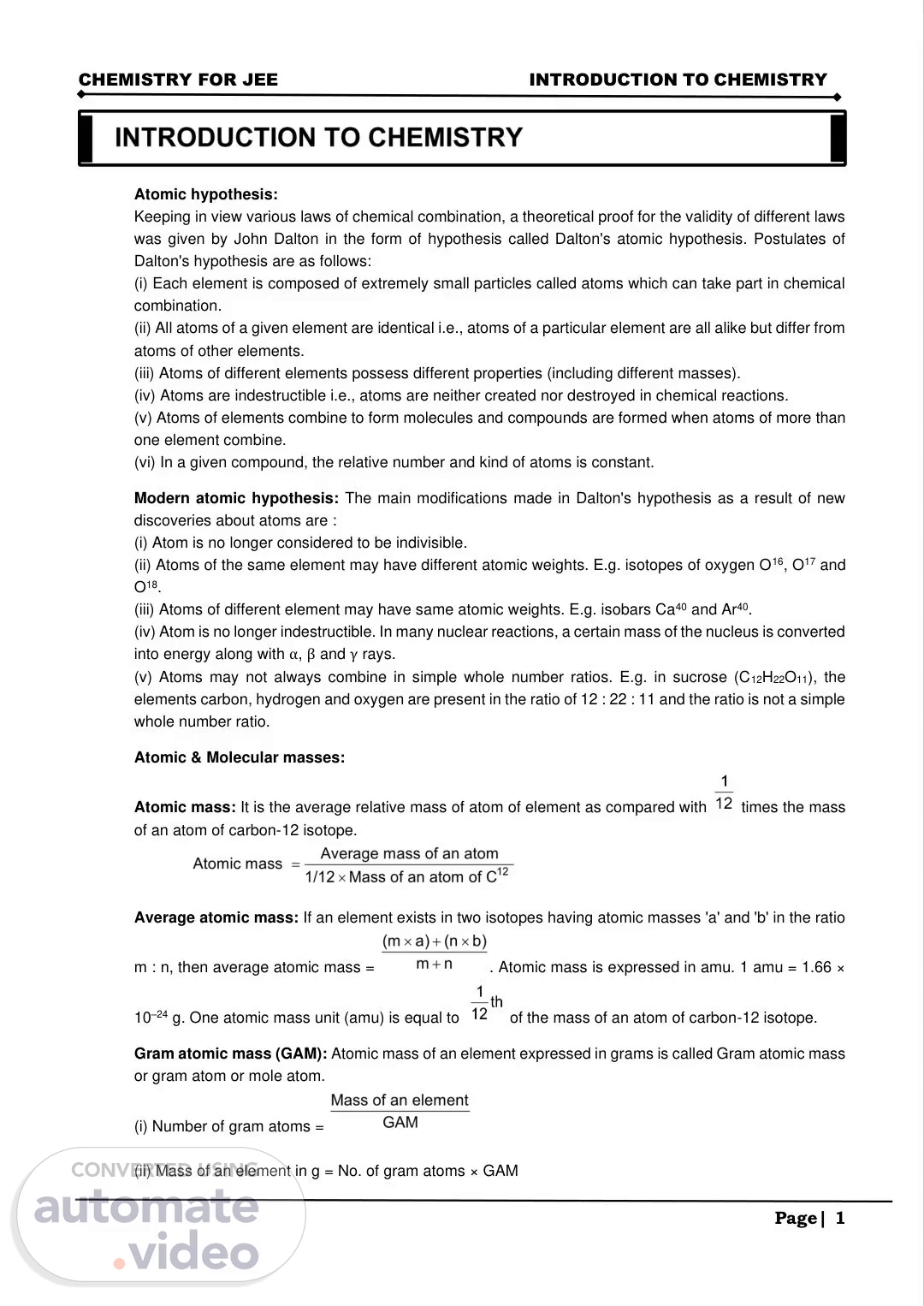 [Audio] CHEMISTRY For JEE INTRODUCTION TO CHEMISTRY Atomic hypothesis: Keeping in view various laws of chemical combination, a theoretical proof for the validity of different laws was given by John Dalton in the form of hypothesis called Dalton's atomic hypothesis. Postulates of Dalton's hypothesis are as follows: (i) Each element is composed of extremely small particles called atoms which can take part in chemical combination. (ii) All atoms of a given element are identical in other words, atoms of a particular element are all alike but differ from atoms of other elements. (iii) Atoms of different elements possess different properties (including different masses). (iv) Atoms are indestructible in other words, atoms are neither created nor destroyed in chemical reactions. (v) Atoms of elements combine to form molecules and compounds are formed when atoms of more than one element combine. (vi) In a given compound, the relative number and kind of atoms is constant. Modern atomic hypothesis: The main modifications made in Dalton's hypothesis as a result of new discoveries about atoms are : (i) Atom is no longer considered to be indivisible. (ii) Atoms of the same element may have different atomic weights. E.g. isotopes of oxygen O-1-6--, O-1-7 and O18. (iii) Atoms of different element may have same atomic weights. E.g. isobars Ca40 and Ar40. (iv) Atom is no longer indestructible. In many nuclear reactions, a certain mass of the nucleus is converted into energy along with α, β and γ rays. (v) Atoms may not always combine in simple whole number ratios. E.g. in sucrose (C12H22O11), the elements carbon, hydrogen and oxygen are present in the ratio of 12 : 22 : 11 and the ratio is not a simple whole number ratio. Atomic & Molecular masses: Atomic mass: It is the average relative mass of atom of element as compared with times the mass of an atom of carbon-12 isotope. Average atomic mass: If an element exists in two isotopes having atomic masses 'a' and 'b' in the ratio m : n, then average atomic mass = . Atomic mass is expressed in amu. 1 amu = 1.66 × 10–24 grams One atomic mass unit (amu) is equal to of the mass of an atom of carbon-12 isotope. Gram atomic mass (G-A-M--): Atomic mass of an element expressed in grams is called Gram atomic mass or gram atom or mole atom. (i) Number of gram atoms = (ii) Mass of an element in g = No. of gram atoms × G-A-M.