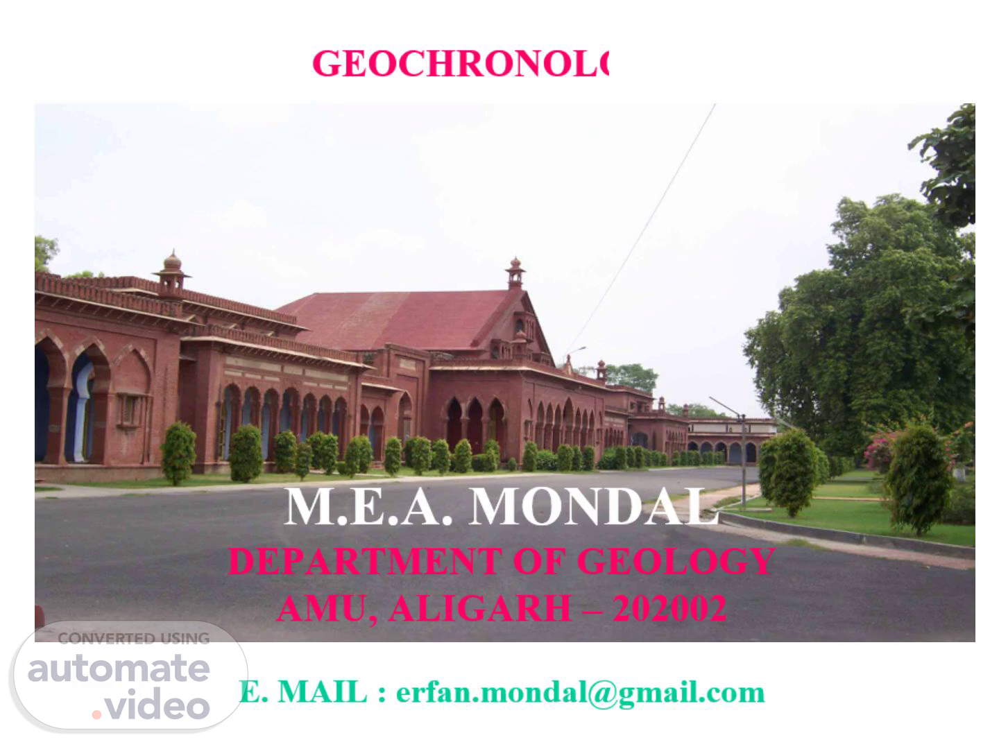 [image] 000 0179. GEOCHRONOLOGY. M.E.A. MONDAL DEPARTMENT OF GEOLOGY AMU, ALIGARH – 202002 E. MAIL : [email protected].