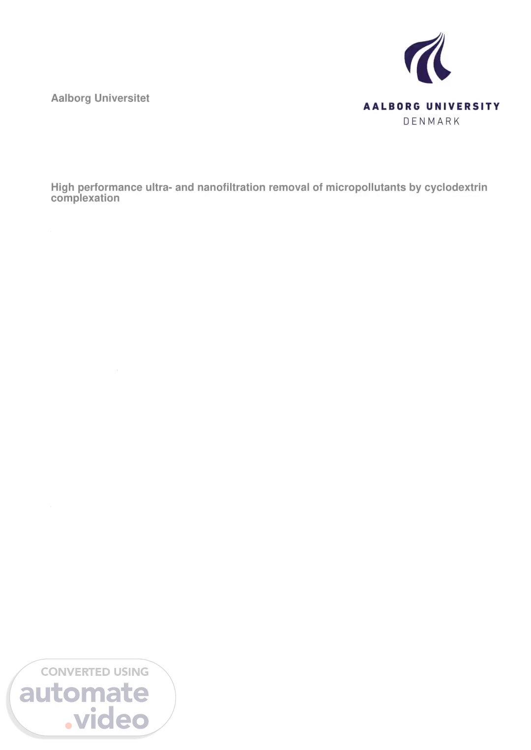 [Virtual Presenter] Aalborg Universitet High performance ultra- and nanofiltration removal of micropollutants by cyclodextrin complexation Jørgensen, Mads Koustrup; Deemter, Dennis; Städe, Lars Wagner; Sørensen, Luna Gade; Madsen, Lærke Nørgaard; Oller, Isabell; Malato, Sixto; Nielsen, Thorbjørn Terndrup; Boffa, Vittorio Published in: Chemical Engineering Research and Design DOI (link to publication from Publisher): 10.1016/j.cherd.2022.10.026 Creative Commons License CC BY 4.0 Publication date: 2022 Document Version Publisher's PDF, also known as Version of record Link to publication from Aalborg University Citation for published version (APA): Jørgensen, M. K., Deemter, D., Städe, L. W., Sørensen, L. G., Madsen, L. N., Oller, I., Malato, S., Nielsen, T. T., & Boffa, V. (2022). High performance ultra- and nanofiltration removal of micropollutants by cyclodextrin complexation. Chemical Engineering Research and Design, 188, 694-703. https://doi.org/10.1016/j.cherd.2022.10.026 General rights Copyright and moral rights for the publications made accessible in the public portal are retained by the authors and/or other copyright owners and it is a condition of accessing publications that users recognise and abide by the legal requirements associated with these rights. - Users may download and print one copy of any publication from the public portal for the purpose of private study or research. - You may not further distribute the material or use it for any profit-making activity or commercial gain - You may freely distribute the URL identifying the publication in the public portal.