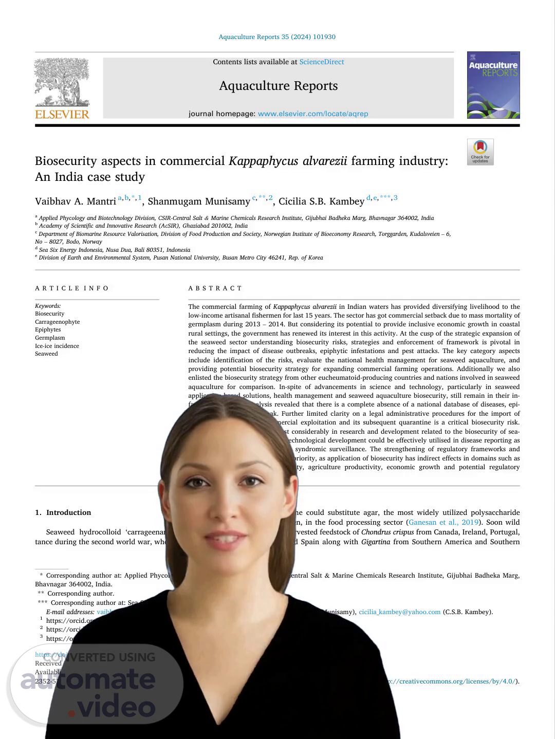 [Audio] We acknowledge that the commercial farming of Kappaphycus alvarezii in Indian waters has provided diversifying livelihood to low-income artisanal fishermen for last 15 years. However, the sector has got commercial setback due to mass mortality of germplasm during 2013 – 2014. The government has renewed its interest in this activity, considering its potential to provide inclusive economic growth in coastal rural settings. At the cusp of the strategic expansion of the seaweed sector, understanding biosecurity risks, strategies, and enforcement of framework is pivotal in reducing the impact of disease outbreaks, epiphytic infestations, and pest attacks. We recommend the following policy measures to enhance national biosecurity frameworks for seaweed in general and K. alvarezii in particular: Firstly, there is an urgent need to invest considerably in research and development related to the biosecurity of seaweeds. Secondly, the involvement of stakeholders, their perception towards benefits of surveillance, monitory value attached to the data collected on epidemiology of diseases, epiphytes, and pests, besides knowledge acquired by farmer, their respective motivations as well as trust and functioning of various institutions are key considerations. Thirdly, the rapid internet-based technological development, coupled with the affordability and availability of smartphones and various apps and similar features could be effectively utilized in disease reporting as well as developing farmer-centric syndromic surveillance. Fourthly, the database of national diseases, epiphytes, and grazers outbreak should be created for all coastal states and union territories. Lastly, the regional facilities for laboratory-based rapid and quick identification of infections and infestations need to be established through government funding support, while the private companies or fishermen co-operatives should be engaged in the continuation of its function and maintenance. There are 31 collaborating centers across 19 different states under the framework of the National Surveillance Programme for Aquatic Animal Diseases in India, and each of these centers should have biosecurity of seaweeds as their additional mandate. We also acknowledge the financial support from the Council for Scientific and Industrial Research, New Delhi and the help received from M/s. Aquagri Processing Ltd. and Dr. Mahima Jaini (M/s. Sea6 Energy) for sharing photographs of field operations. We thank Director CSIR-CSMCRI for the facilities. This manuscript has PRIS registration no 80/2023. We conclude that there is a need to invest in research and development related to the biosecurity of seaweeds and to strengthen regulatory frameworks and policy to ensure the effective implementation of biosecurity measures. We also recommend the capacity building and training of seaweed farmers on the identification of diseases, epiphytes, and pests and evaluating the preliminary syndromes of such outbreaks. Furthermore, we suggest that the government should provide financial support to establish regional facilities for laboratory-based rapid and quick identification of infections and infestations. Additionally, we recommend that the private companies or fishermen co-operatives should be engaged in the continuation of its function and maintenance. We also emphasize the importance of creating a database of national diseases, epiphytes, and grazers outbreak and to evaluate the national health management for seaweed aquaculture. Finally, we stress the need to establish a national surveillance programme for aquatic animal diseases in India to ensure the effective implementation of biosecurity measures. We also acknowledge the help received from various institutions and individuals for their support and cooperation. We also recommend that the government should provide financial support to establish regional facilities for laboratory-based rapid and quick identification of infections and infestations. We also suggest that the private companies or fishermen co-operatives should be engaged in the continuation of its function and maintenance. We also emphasize the importance of creating a database of national diseases, epiphytes, and grazers outbreak and to evaluate the.