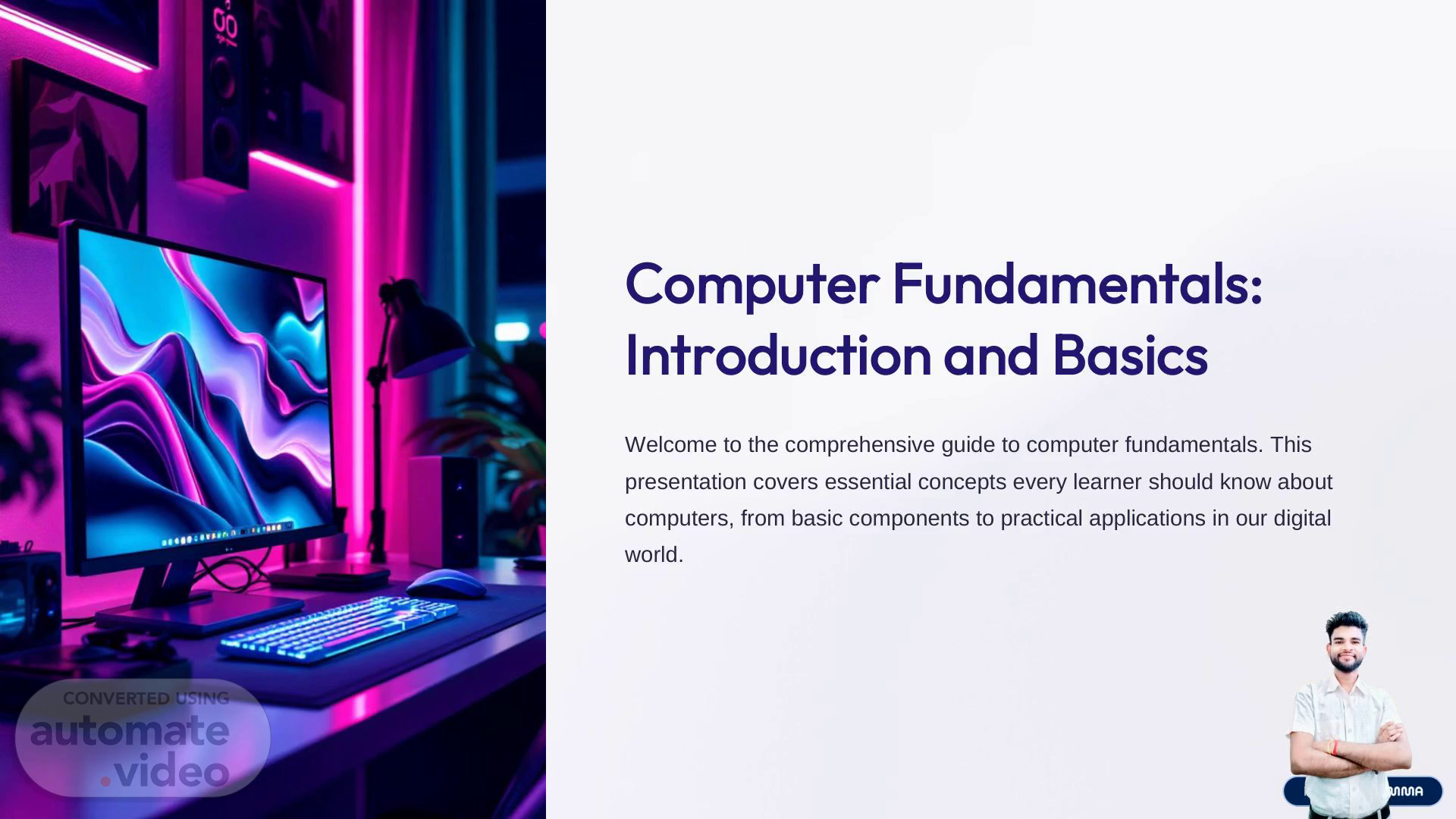 [Audio] Computer Fundamentals: Introduction and Basics Welcome to the comprehensive guide to computer fundamentals. This presentation covers essential concepts every learner should know about computers, from basic components to practical applications in our digital world. preencoded.png.
