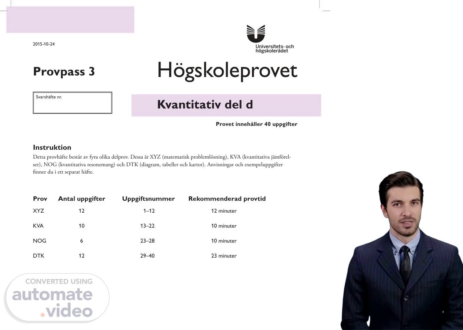 [Virtual Presenter] Dagens datum för provet är den 24 oktober 2015. Det är provpass nummer 3 och vårt fokus kommer att ligga på den kvantitativa delen av Högskoleprovet. Denna del av provet består av 40 uppgifter som du har 55 minuter på dig att lösa. För att kunna öva inför provet finns det ett separat häfte med instruktioner och exempeluppgifter. I detta provhäfte kommer du att stöta på fyra olika delprov: XYZ som handlar om matematisk problemlösning, KVA som handlar om kvantitativa jämförelser, NOG som handlar om kvantitativa resonemang, och DTK som handlar om diagram, tabeller och kartor. Var noga med att markera dina svar i svarshäftet inom den rekommenderade tiden för varje delprov. Om du inte kan lösa en uppgift, försök då att bedöma vilket svarsalternativ som verkar mest rimligt. Glöm inte att det inte finns några poängavdrag om du svarar fel. Du kan även använda provhäftet som kladdpapper. På nästa sida kommer provet att börja och det är viktigt att du väntar på instruktionerna från provledaren innan du börjar. Lycka till!.