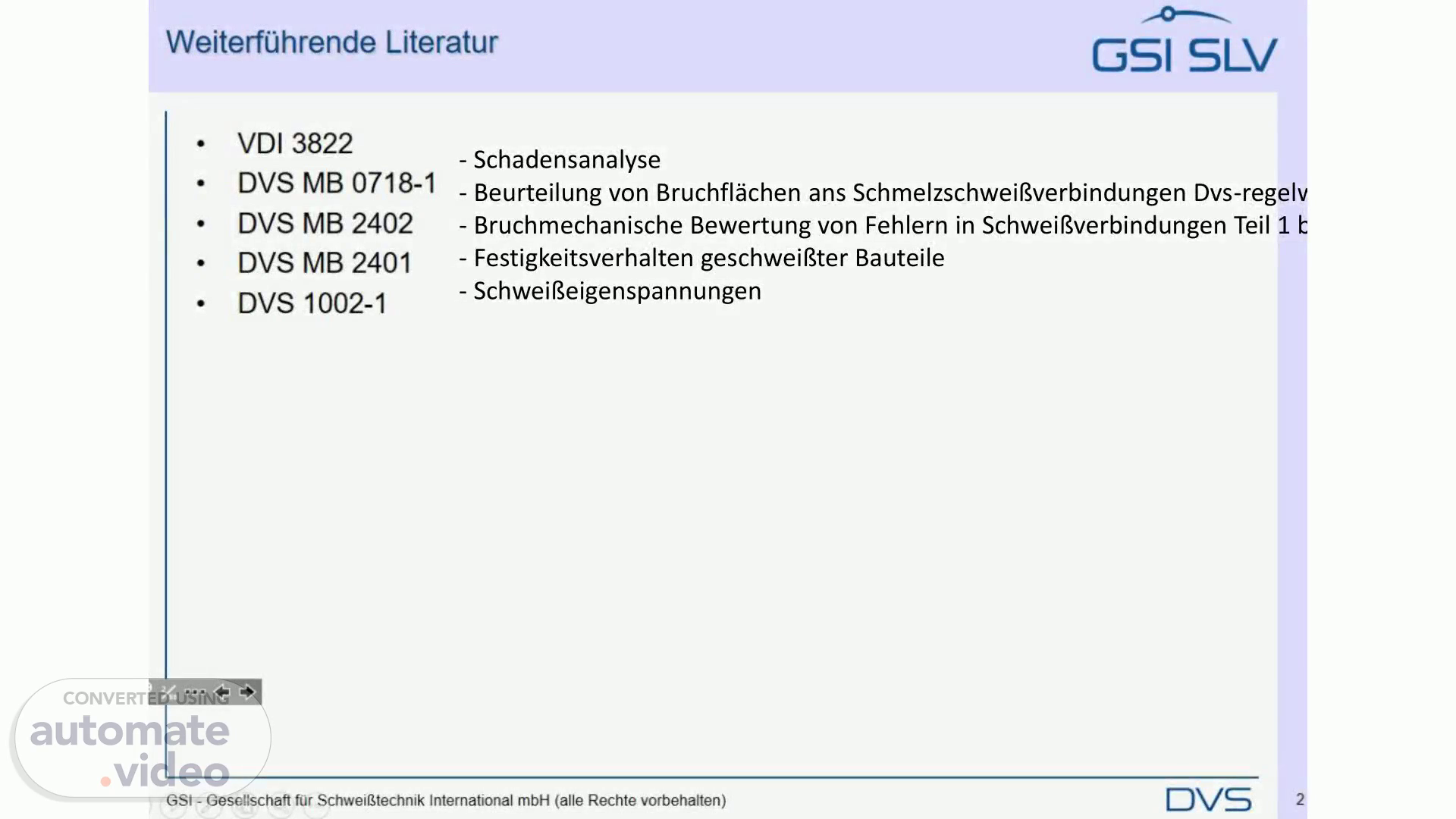 . . Weiterführende Literatur o GSI SLV VDI 3822 DVS MB 0718-1 DVS MB 2402 DVS MB 2401 DVS 1002-1 - Schadensanalyse - Beurteilung von Bruchflächen ans Schmelzschweißverbindungen Dvs-regelv - Bruchmechanische Bewertung von Fehlern in Schweißverbindungen Teil 1 - Festigkeitsverhalten geschweißter Bauteile - Schweißeigenspannungen GSI - Gesellschaft für Schweißtechnik International mbH (alle Ræhte vorbehatten) DVS 2.