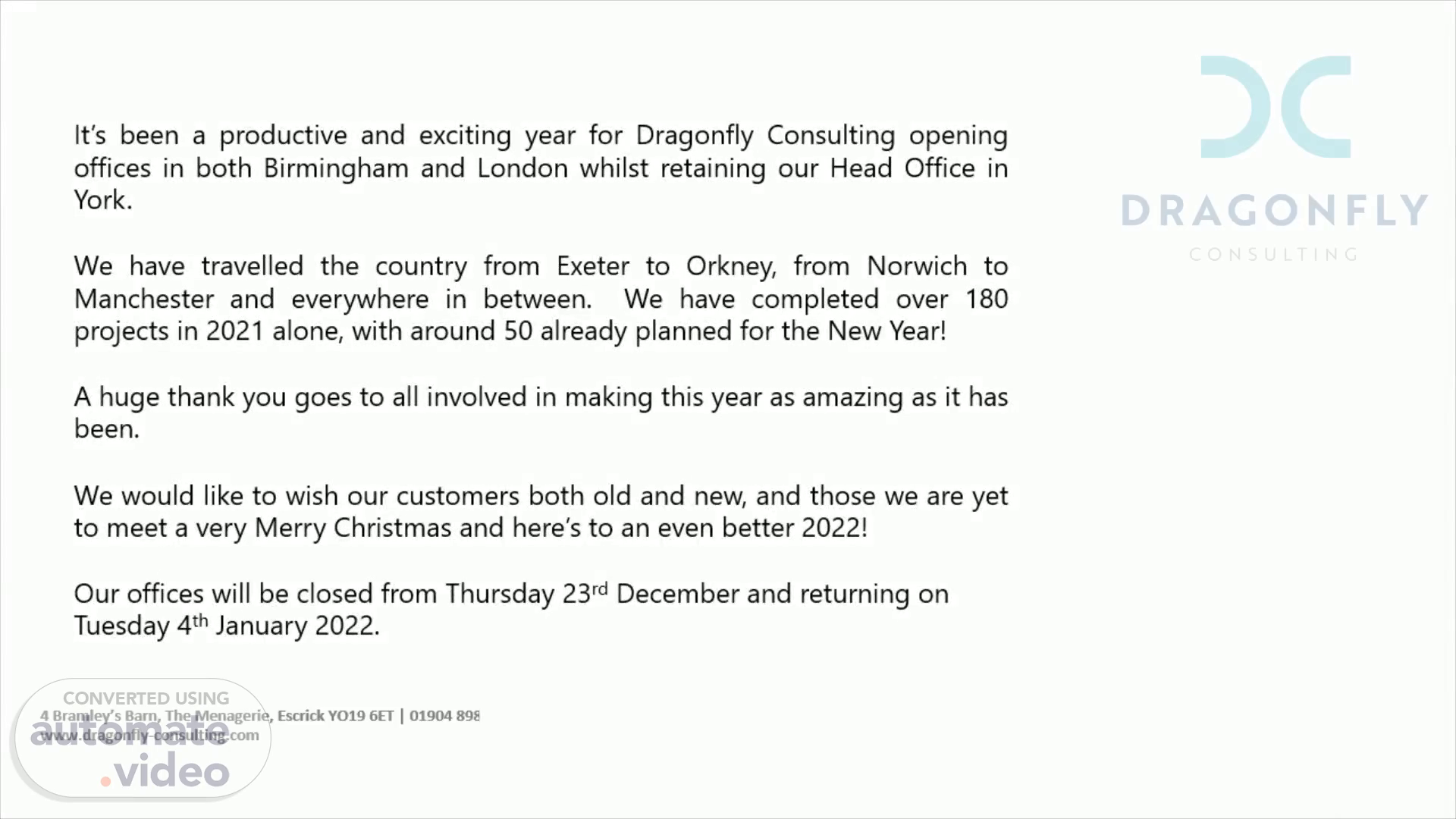 It’s been a productive and exciting year for Dragonfly Consulting opening offices in both Birmingham and London whilst retaining our Head Office in York. We have travelled the country from Exeter to Orkney, from Norwich to Manchester and everywhere in between. We have completed over 180 projects in 2021 alone, with around 50 already planned for the New Year! A huge thank you goes to all involved in making this year as amazing as it has been. We would like to wish our customers both old and new, and those we are yet to meet a very Merry Christmas and here’s to an even better 2022! Our offices will be closed from Thursday 23 rd December and returning on Tuesday 4 th January 2022..