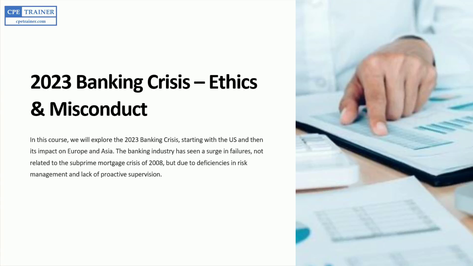 [Audio] Welcome to this course on the 2023 Banking Crisis and the critical factors that led to the collapse of banks like Silicon Valley Bank and First Republic Bank. In recent times, the banking industry has witnessed a surge in failures, prompting concerns and a closer examination of the underlying causes. These bank collapses represent a departure from the norm, as they are not connected to the subprime mortgage crisis of 2008 but are instead rooted in other critical issues, notably deficiencies in risk management and shortcomings in proactive supervision. One of the key drivers of these failures is the impact of rising interest rates, which has created significant liquidity challenges affecting both the asset and liability sides of banks' balance sheets. This shift in the interest rate landscape poses a formidable obstacle to banks worldwide, potentially resulting in reduced profitability and a wave of consolidation within the industry. In this course, we will delve into the intricacies of the 2023 Banking Crisis, starting with an exploration of the crisis in the United States. We will analyze the contributing factors, consequences, and lessons learned from these banking collapses, shedding light on the broader implications for the global banking sector. Join us as we embark on this journey to better understand the challenges and complexities that have shaken the banking world in 2023, and explore the strategies and solutions that can help navigate these turbulent waters successfully. Let's take a look at the 2023 Banking Crisis in the US first and then continue with its repercussions on Europe and Asia:.