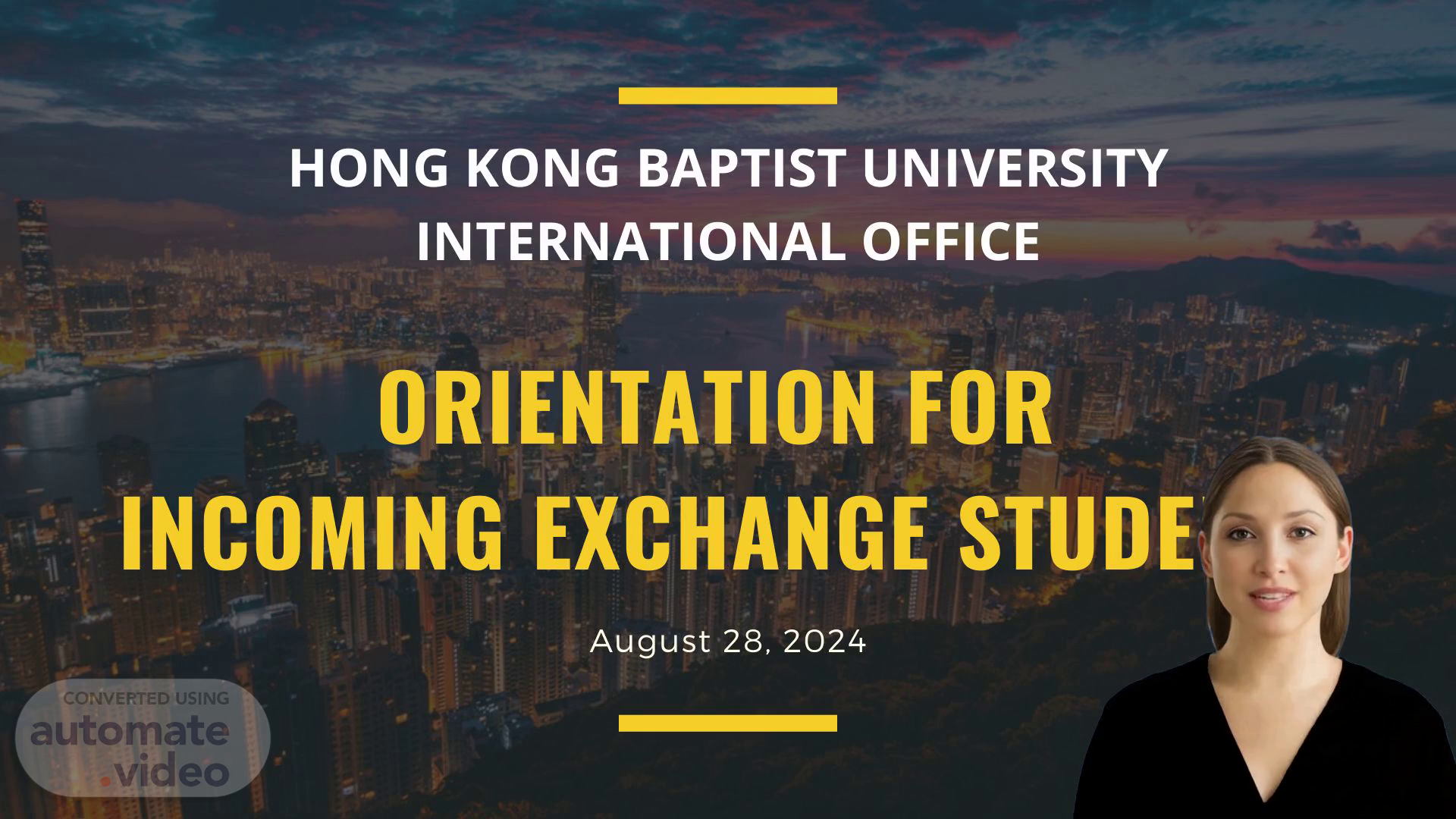 [Virtual Presenter] We are thrilled to welcome you to Hong Kong Baptist University (H-K-B-U-) for the 2024/25 academic year. It is our pleasure to provide you with important notes and information that will help you navigate your exchange experience at H-K-B-U-. During this orientation we will cover key topics such as visa and insurance requirements class schedules academic issues and regulations Chinese language classes and living in Hong Kong. It is important to keep in mind that exchange students are expected to attend all enrolled classes communicate primarily in English and follow certain rules and regulations while studying at H-K-B-U-. We strongly advise that you prioritize consistent studying throughout the semester and avoid procrastination until the end of the semester. Additionally we urge you to carry a valid photo identification and exercise caution while living in Hong Kong. Thank you for your attention..