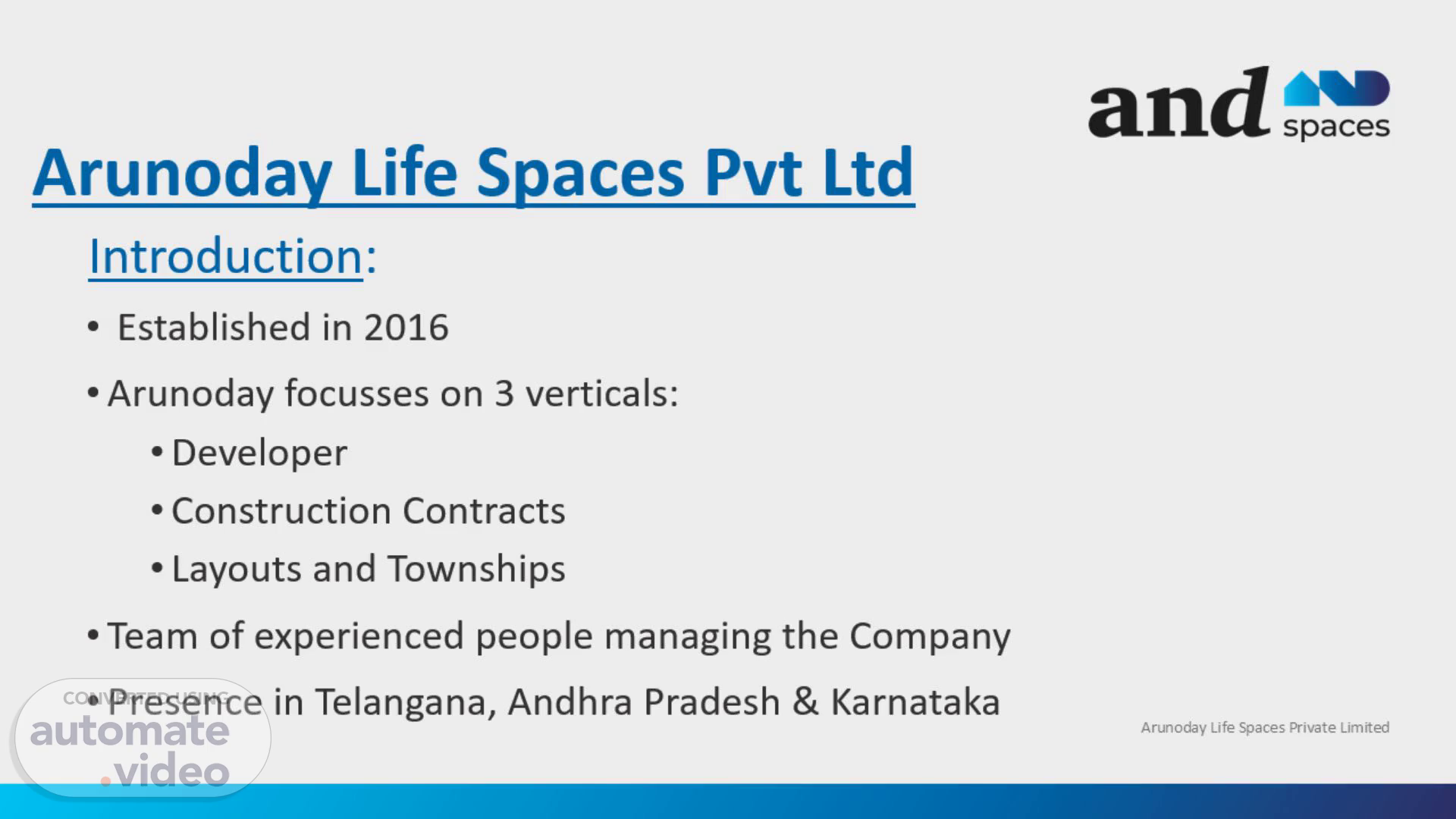 [Audio] The company, Arunoday Life Spaces Pvt Ltd, is a prominent player in the construction industry. Its primary focus is on developing projects that cater to the needs of developers, including construction contracts, layout designs, and township development. Established in 2016, the company operates primarily in the states of Telangana, Andhra Pradesh, and Karnataka. The management team consists of seasoned experts who oversee the organization's operations..