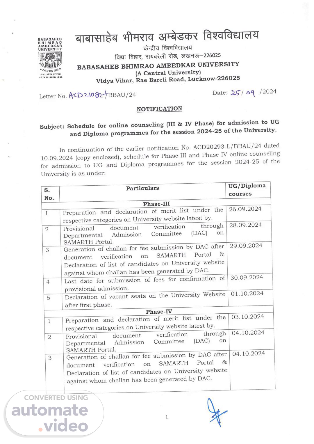 BABASAHEB BHIMRAO AMBEDKAR UNIVERSITY FRSFTØ5—226025 BABASAHEB BHIMRAO AMBEDKAR UNIVERSITY (A Central University) Vidya Vihar, Rae Bareli Road, Lucknow-226025 Letter No. ACD üh08i-hBBAU/24 Date: 25/ /2024 NOTIFICATION Subject: Schedule for online counseling (III & IV Phase) for admission to UG and Diploma programmes for the session 2024-25 of the University. In continuation of the earlier notification No. ACD20293-L/BBAU /24 dated (copy enclosed), schedule for Phase III and Phase IV online counseling for admission to UG and Diploma programmes for the session 2024-25 of the University is as under: s. No. 2 3 4 5 1 2 3 Particulars Phase-III Preparation and declaration of merit list under the respective categories on University website latest by. Provisional document verification through Departmental Admission Committee (DAC) on SAMARTH Portal. Generation of challan for fee submission by DAC after document verification on SAMARTH Portal & Declaration of list of candidates on University website against whom challan has been generated by DAC. Last date for submission of fees for confirmation of provisional admission. Declaration of vacant seats on the University Website after first phase. Phase-IV Preparation and declaration of merit list under the respective categories on University website latest by. Provisional document verification through Departmental Admission Committee (DAC) on SAMARTH Portal. Generation of challan for fee submission by DAC after document verification on SAMARTH Portal & Declaration of list of candidates on University website against whom challan has been generated by DAC. 1 UG / Diploma courses 26.09.2024 28.09.2024 29.09.2024 30.09.2024 01.10.2024 03.10.2024 04.10.2024 04.10.2024.