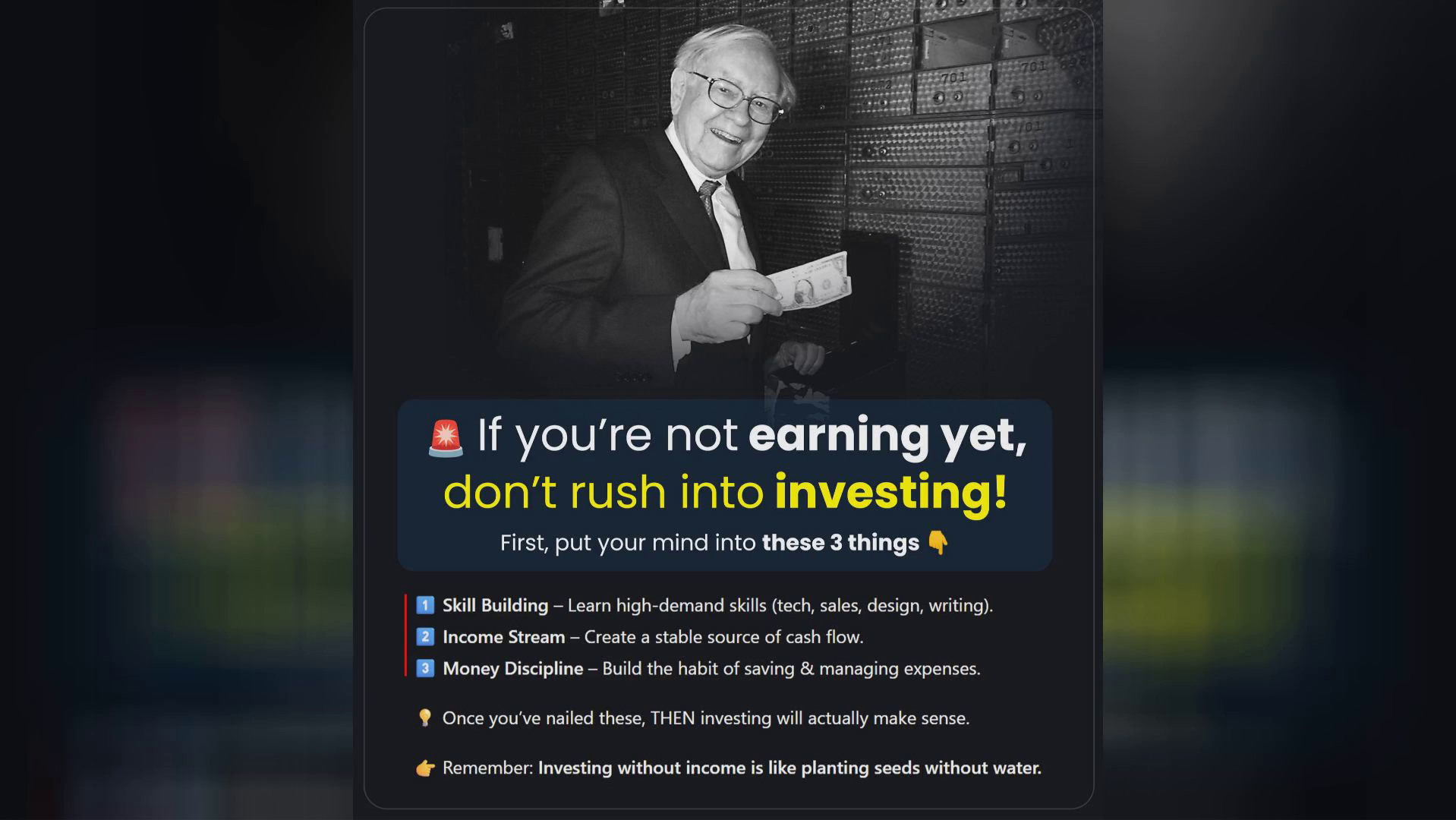 [Audio] . If you're not earning yet, don't rush into investing! First, put your mind into these 3 things Skill Building — Learn high-demand skills (tech, sales, design, writing). Income Stream — Create a stable source of cash flow. Money Discipline — Build the habit of saving & managing expenses. Once you've nailed these, THEN investing will actually make sense. & Remember: Investing without income is like planting seeds without water..