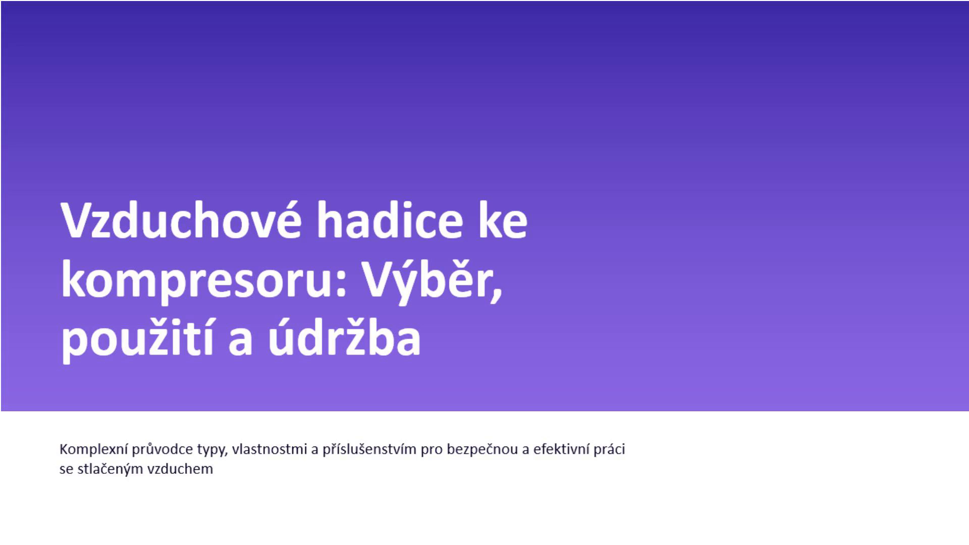 [Audio] Na tomto snímku se zaměříme na různé typy vzduchových hadic používaných ke kompresoru. Nejprve máme vzduchové hadice, které slouží jako základní propojení mezi kompresorem a pneumatickým nářadím. Jsou vhodné pro běžné aplikace, kde není potřeba vysoký tlak nebo speciální odolnost. Dále jsou zde tlakové hadice, které představují robustní řešení s pracovními tlaky až do 16 bar. Jsou vyztužené vysokou pevností, což je činí ideálními pro náročné provozy, kde je potřeba větší odolnost a spolehlivost. Nakonec zmíníme spirálové hadice, které jsou flexibilní a kompaktní. Jsou ideální pro mobilní použití a menší dílny, kde je potřeba snadná manipulace. Často jsou vybavené rychlospojkami, což umožňuje rychlé a jednoduché připojení k nářadí nebo kompresoru. Tímto způsobem si můžete vybrat hadici podle konkrétních potřeb vašeho provozu..