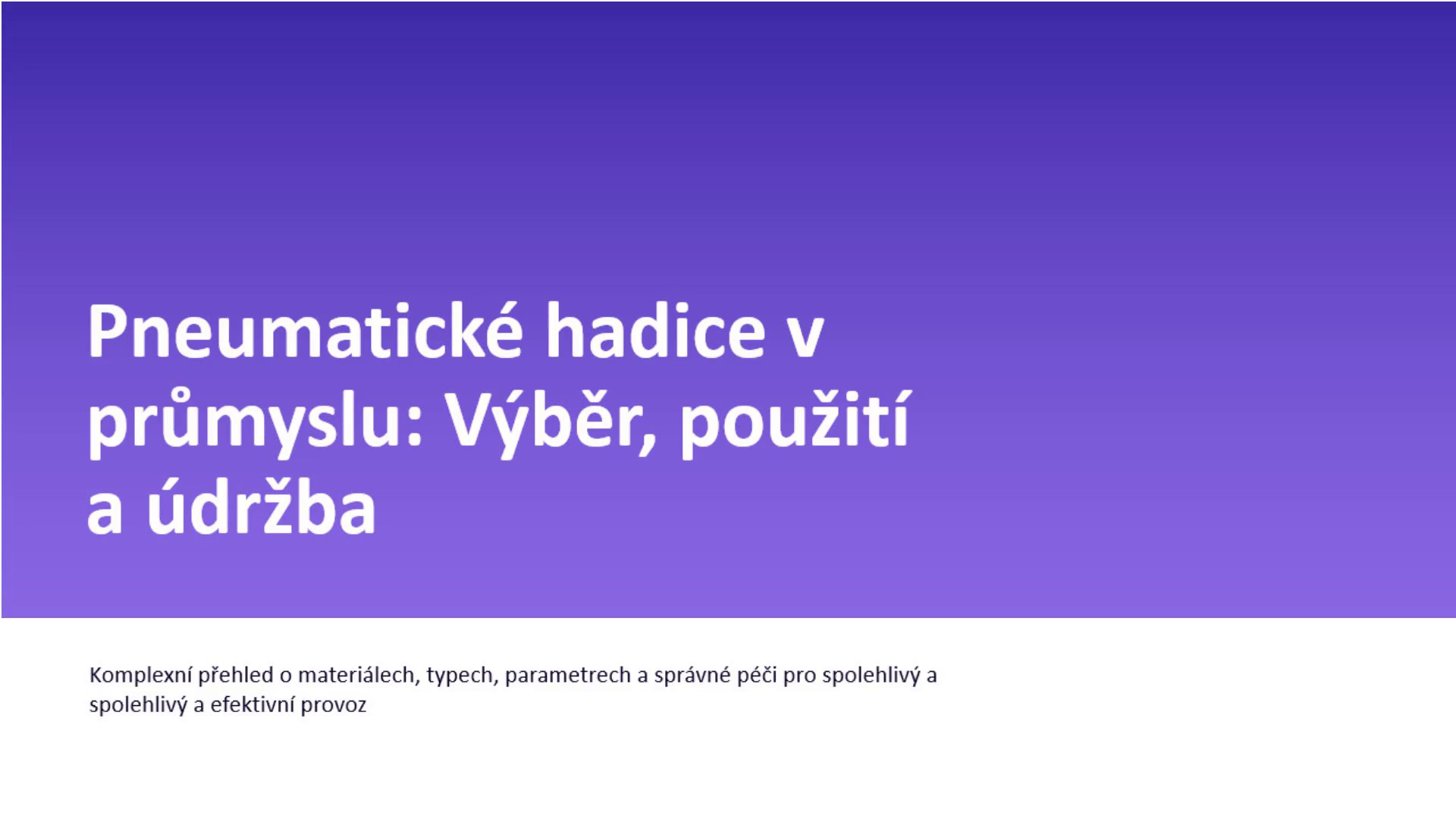 [Audio] Dnes si představíme pneumatické hadice, které jsou nezbytnou součástí moderních průmyslových provozů, zejména v odvětvích jako potravinářství, kosmetika a farmacie. Tyto hadice slouží k bezpečnému a efektivnímu přenosu stlačeného vzduchu, který pohání různá zařízení a nářadí. Vzhledem k přísným hygienickým a bezpečnostním normám je velmi důležité vybírat hadice, které splňují vysoké standardy kvality, odolnosti a jsou kompatibilní s používaným pneumatickým systémem. Tento úvod vám poskytne základní přehled o významu a roli pneumatických hadic v náročných výrobních prostředích..