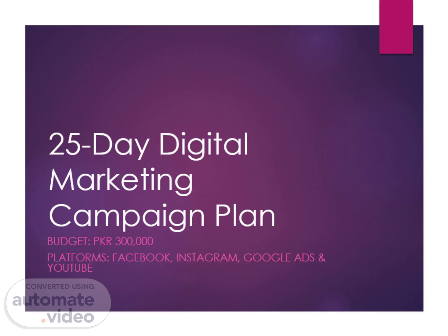 [Audio] We are now looking at the budget allocation for this 25-day digital marketing campaign. The total budget has been allocated as PKR 300000 across various platforms. A significant portion of the budget, PKR 120000, has been dedicated to Facebook and Instagram Ads. This investment is expected to reach a substantial audience through these platforms. Google Search Ads have received PKR 90000, which is 30% of the budget. This will enable targeting of the audience through search queries and driving traffic to the website. YouTube Video Ads have been allocated PKR 60000, which is 20% of the budget. This will allow showcasing of the brand's story and engagement with the audience through high-quality video content. Testing and optimization have been reserved for PKR 30000, which is 10% of the budget. This will provide flexibility to adjust the strategy mid-campaign and ensure optimal results. With this budget allocation, it is expected that the campaign objectives will be achieved and meaningful results will be driven..