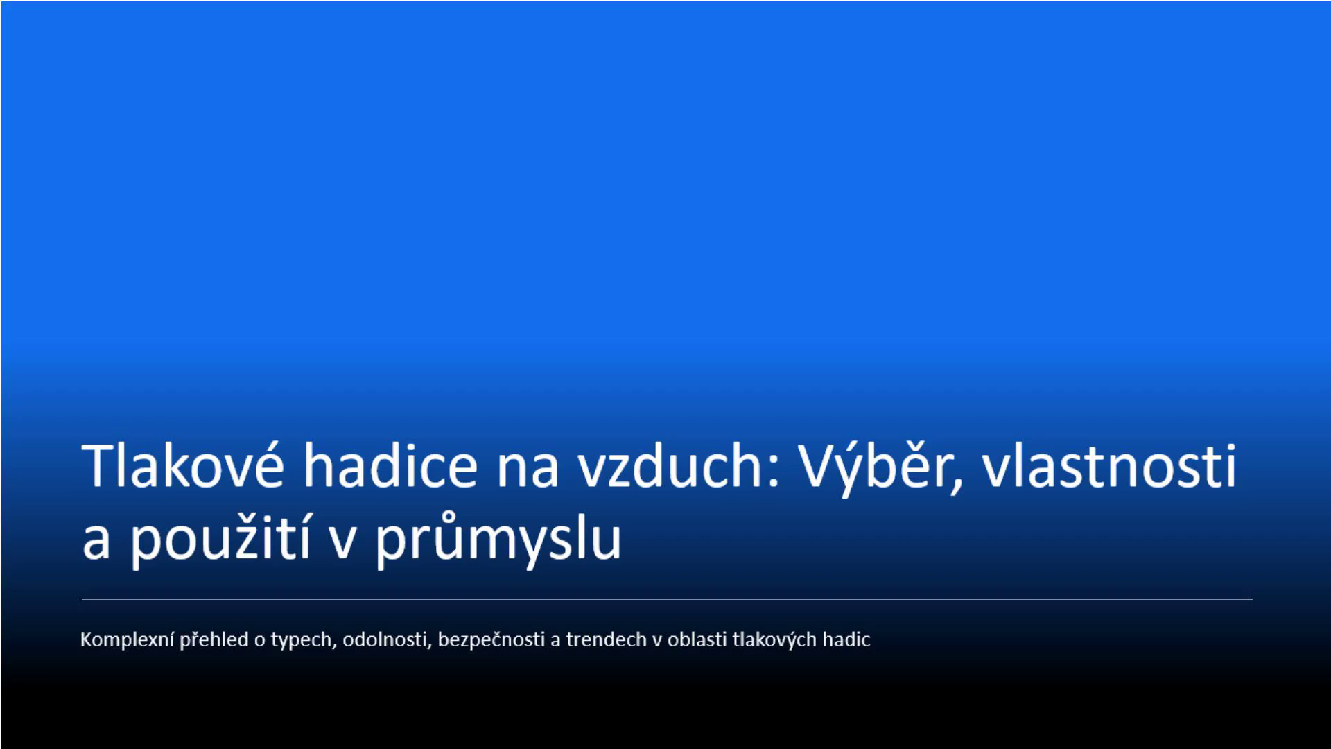 [Audio] Tlakové hadice na vzduch jsou klíčovým prvkem v průmyslových provozech, protože umožňují bezpečný a efektivní přenos stlačeného vzduchu. Používají se především k přenosu vzduchu od kompresoru k pneumatickému nářadí, což je nezbytné pro správný chod zařízení a zároveň zajišťuje bezpečnost pracovníků. Hadice musí být odolné vůči provoznímu tlaku a mechanickému namáhání, což je zvláště důležité v odvětvích jako potravinářský, kosmetický a farmaceutický průmysl. Správný výběr tlakové hadice je proto zásadní pro spolehlivost celého provozu, přičemž bezpečnost a kvalita jsou vždy na prvním místě..