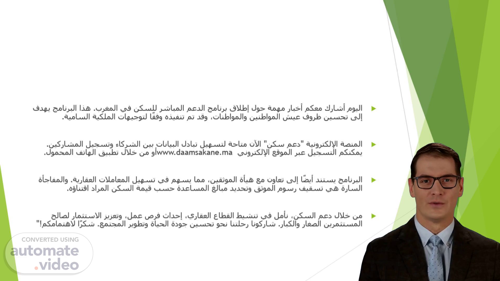 [Virtual Presenter] انه اليوم يُطلق برنامج الدعم المباشر للسكن في المغرب الذي يهدف إلى تحسين الظروف الحياتية للمواطنين والمواطنات، وذلك بموجب توجيهات الملكية السامية. كما أن المنصة الإلكترونية تسهل تبادل البيانات بين الشركاء وتسجيل المشاركين كما يستند البرنامج إلى تعاون مع هيأة الموثقين. كما يمكن الحصول على المساعدة بشكل سهل وبفهم جيد لمن يرغب في الحصول على السكن. وعلى هذا الأساس، يعد ذلك البرنامج بالإضافة إلى تحقيق الاستفادة الإجتماعية، بما في ذلك تنشيط القطاع العقاري وإحداث الفرص العملية، وتعزيز الاستثمار لصالح المواطنين. استشارنا واحششنا في هذه المسيرة لتحسين جودة الحياة وتطوير المجتمع. وكما نشكركم على الاهتمام..