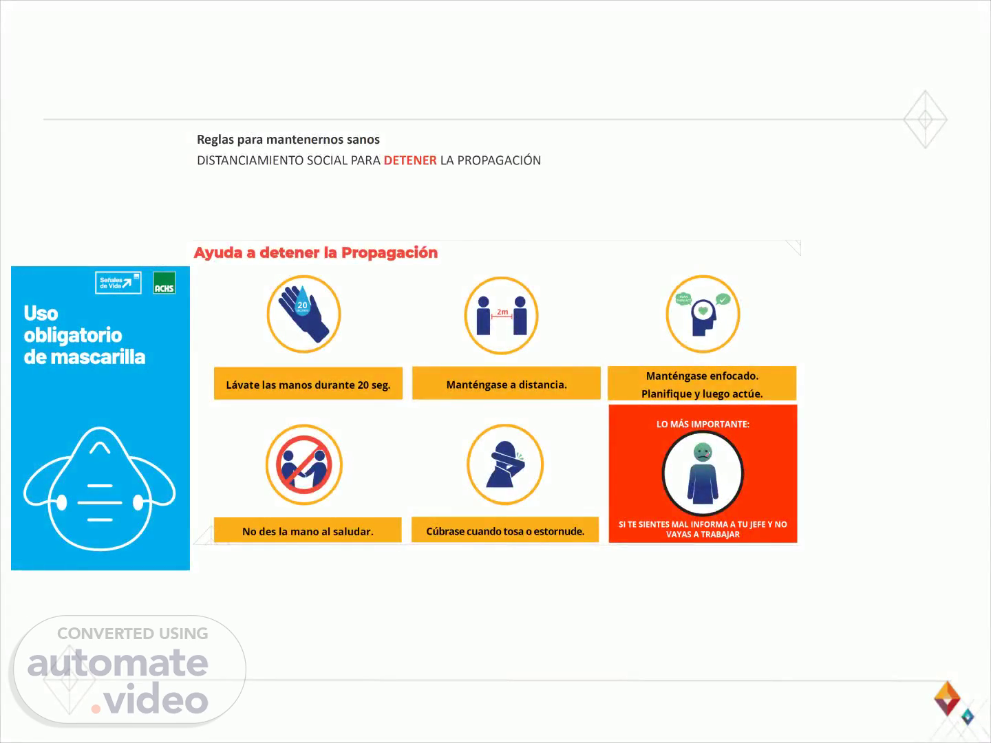 Ayuda a detener la Propagaci6n Låvate las manos durante 20 seg. No des la mano al saludar. Manténgase a distancia. Cübrase cuando tosa o estornude. Manténgase enfocado. Planifique y luego actüe. LO MAs IMPORTANTE: Sl TE SIENTES MAL INFORMA A TU JEFE Y NO VAYAS A TRABAJAR.