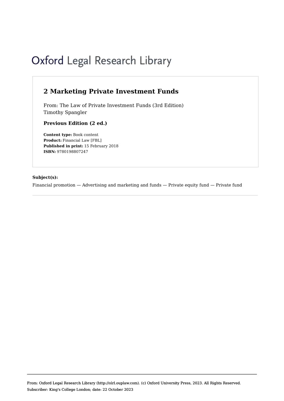 [Audio] From: Oxford Legal Research Library (http://olrl.ouplaw.com). (c) Oxford University Press, 2023. All Rights Reserved. Subscriber: King's College London; date: 22 October 2023 Content type: Book content Product: Financial Law [FBL] Published in print: 15 February 2018 ISBN: 9780198807247 2 Marketing Private Investment Funds From: The Law of Private Investment Funds (3rd Edition) Timothy Spangler Previous Edition (2 ed.) Subject(s): Financial promotion — Advertising and marketing and funds — Private equity fund — Private fund.