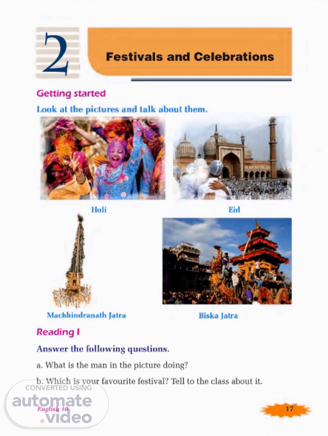 English 10 17 2 Festivals and Celebrations Getting started Look at the pictures and talk about them. Holi Eid Biska Jatra Machhindranath Jatra Reading I Answer the following questions. a. What is the man in the picture doing? b. Which is your favourite festival? Tell to the class about it..