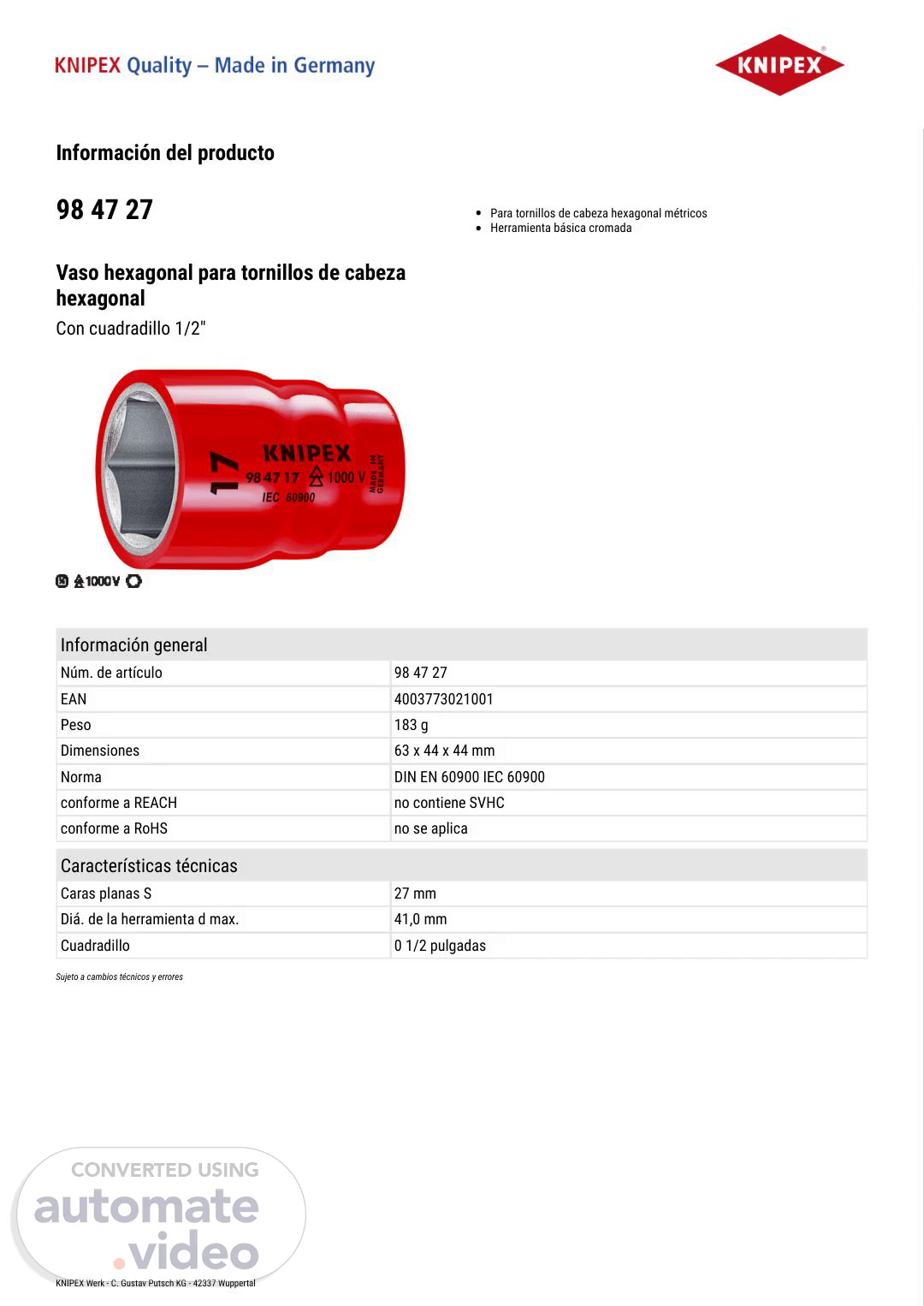 Información del producto 98 47 27 Vaso hexagonal para tornillos de cabeza hexagonal Con cuadradillo 1/2" • Para tornillos de cabeza hexagonal métricos • Herramienta básica cromada Información general Núm. de artículo 98 47 27 EAN 4003773021001 Peso 183 g Dimensiones 63 x 44 x 44 mm Norma DIN EN 60900 IEC 60900 conforme a REACH no contiene SVHC conforme a RoHS no se aplica Características técnicas Caras planas S 27 mm Diá. de la herramienta d max. 41,0 mm Cuadradillo 0 1/2 pulgadas Sujeto a cambios técnicos y errores KNIPEX Werk - C. Gustav Putsch KG - 42337 Wuppertal.