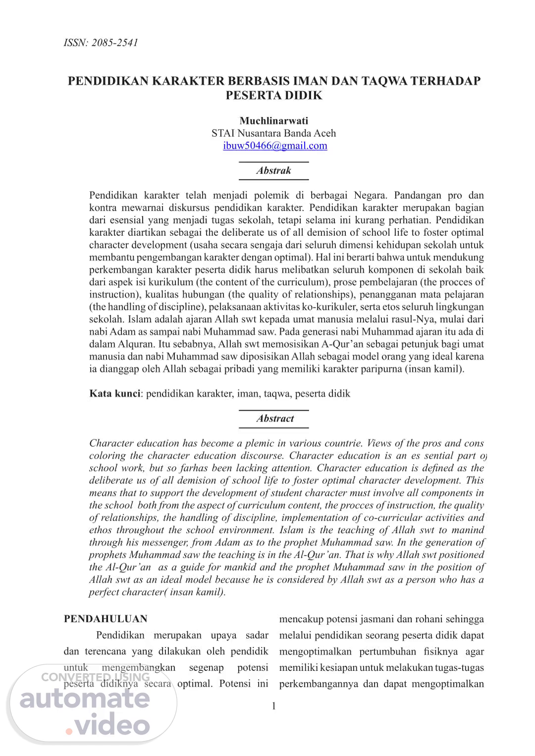 [Audio] 1 ISSN: 2085-2541 PENDIDIKAN KARAKTER BERBASIS IMAN DAN TAQWA TERHADAP PESERTA DIDIK Muchlinarwati STAI Nusantara Banda Aceh [email protected] Abstrak Pendidikan karakter telah menjadi polemik di berbagai Negara. Pandangan pro dan kontra mewarnai diskursus pendidikan karakter. Pendidikan karakter merupakan bagian dari esensial yang menjadi tugas sekolah, tetapi selama ini kurang perhatian. Pendidikan karakter diartikan sebagai the deliberate us of all demision of school life to foster optimal character development (usaha secara sengaja dari seluruh dimensi kehidupan sekolah untuk membantu pengembangan karakter dengan optimal). Hal ini berarti bahwa untuk mendukung perkembangan karakter peserta didik harus melibatkan seluruh komponen di sekolah baik dari aspek isi kurikulum (the content of the curriculum), prose pembelajaran (the procces of instruction), kualitas hubungan (the quality of relationships), penangganan mata pelajaran (the handling of discipline), pelaksanaan aktivitas ko-kurikuler, serta etos seluruh lingkungan sekolah. Islam adalah ajaran Allah swt kepada umat manusia melalui rasul-Nya, mulai dari nabi Adam as sampai nabi Muhammad saw. Pada generasi nabi Muhammad ajaran itu ada di dalam Alquran. Itu sebabnya, Allah swt memosisikan A-Qur'an sebagai petunjuk bagi umat manusia dan nabi Muhammad saw diposisikan Allah sebagai model orang yang ideal karena ia dianggap oleh Allah sebagai pribadi yang memiliki karakter paripurna (insan kamil). Kata kunci: pendidikan karakter, iman, taqwa, peserta didik Abstract Character education has become a plemic in various countrie. Views of the pros and cons coloring the character education discourse. Character education is an essential part of school work, but so farhas been lacking attention. Character education is defined as the deliberate us of all demision of school life to foster optimal character development. This means that to support the development of student character must involve all components in the school both from the aspect of curriculum content, the procces of instruction, the quality of relationships, the handling of discipline, implementation of co-curricular activities and ethos throughout the school environment. Islam is the teaching of Allah swt to manind through his messenger, from Adam as to the prophet Muhammad saw. In the generation of prophets Muhammad saw the teaching is in the Al-Qur'an. That is why Allah swt positioned the Al-Qur'an as a guide for mankid and the prophet Muhammad saw in the position of Allah swt as an ideal model because he is considered by Allah swt as a person who has a perfect character( insan kamil). PENDAHULUAN Pendidikan merupakan upaya sadar dan terencana yang dilakukan oleh pendidik untuk mengembangkan segenap potensi peserta didiknya secara optimal. Potensi ini mencakup potensi jasmani dan rohani sehingga melalui pendidikan seorang peserta didik dapat mengoptimalkan pertumbuhan fisiknya agar memiliki kesiapan untuk melakukan tugas-tugas perkembangannya dan dapat mengoptimalkan.