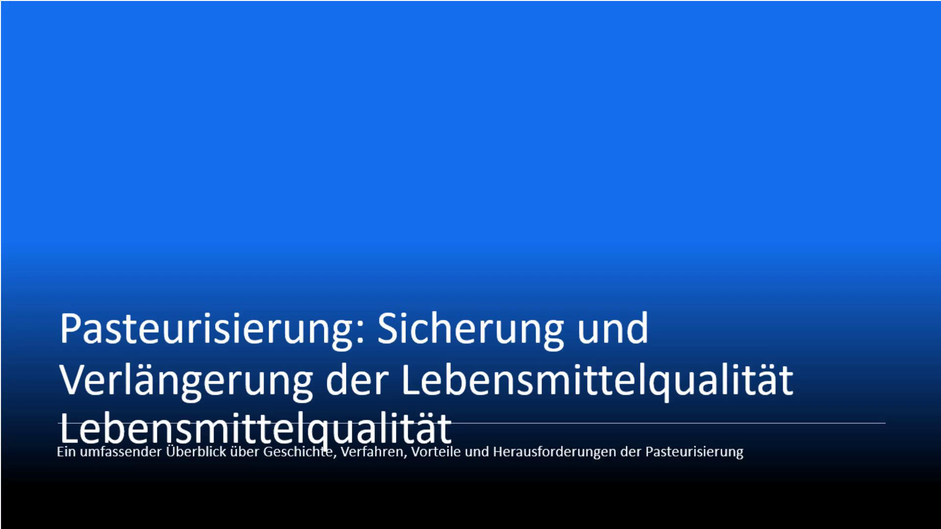 [Audio] Die Pasteurisierung erfolgt durch eine kurze Hitzeeinwirkung von 15 bis 30 Sekunden bis zu wenigen Minuten bei moderaten Temperaturen. Diese Methode tötet zuverlässig die meisten Lebensmittelverderber sowie viele krankheitserregende Bakterien ab. Dabei bleibt der Geschmack, die Konsistenz und der Nährwert der Lebensmittel weitgehend erhalten. Das Hauptziel der Pasteurisierung ist es, die Haltbarkeit der Produkte zu verlängern, ohne die Qualität zu beeinträchtigen..