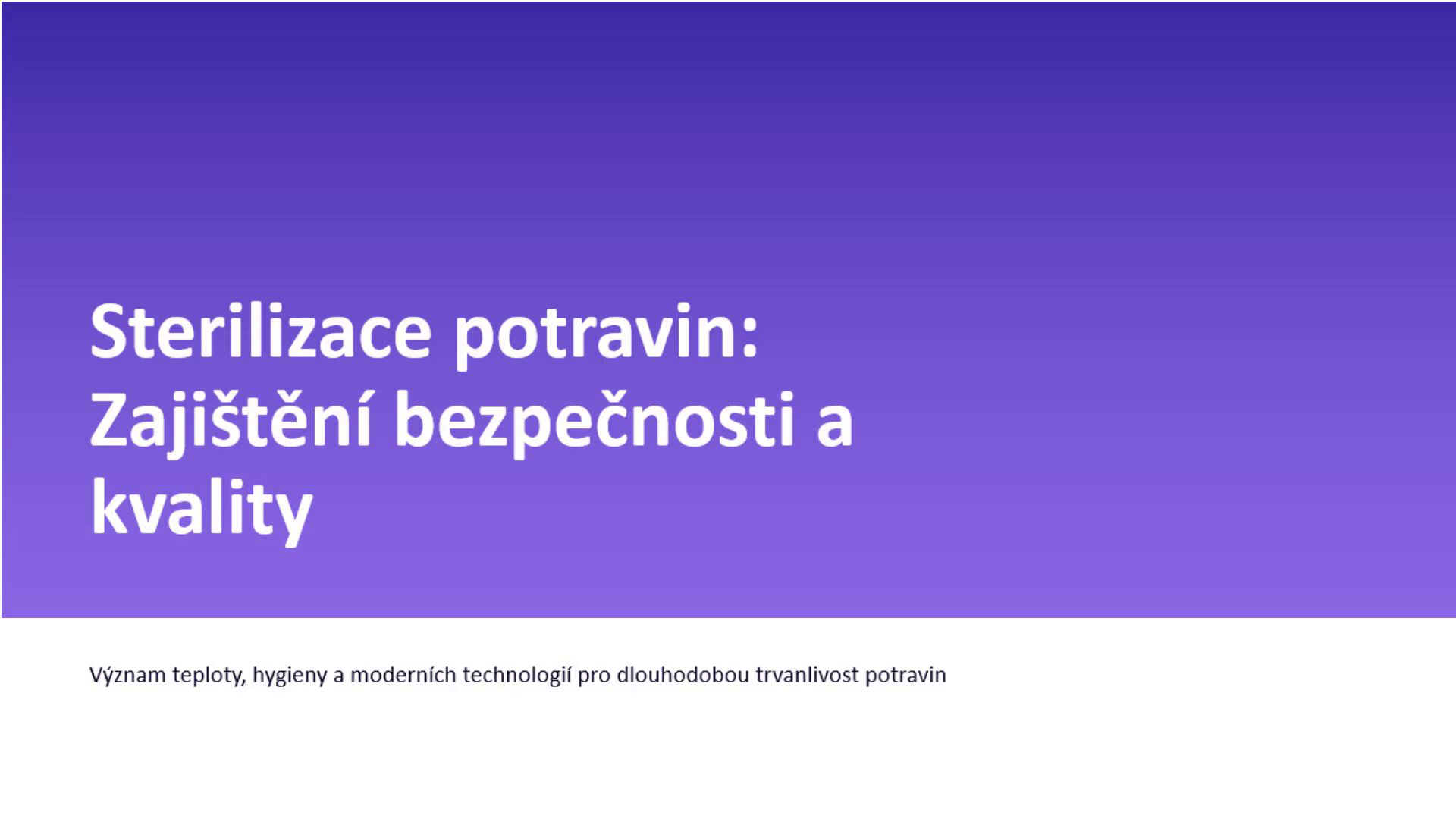 [Audio] Prezentace vznikla ve spolupráci s laboratoří KVALIFIKACE-VALIDACE. Laboratoř KVALIFIKACE-VALIDACE provádí měření rozložení teploty v autoklávách a zabývá se validací procesů pasterizace a sterilizace v autoklávách. Více informací o termických procesech naleznete na následujících stránkách: https://kvalifikace-validace.cz/sterilizace-potravin/.