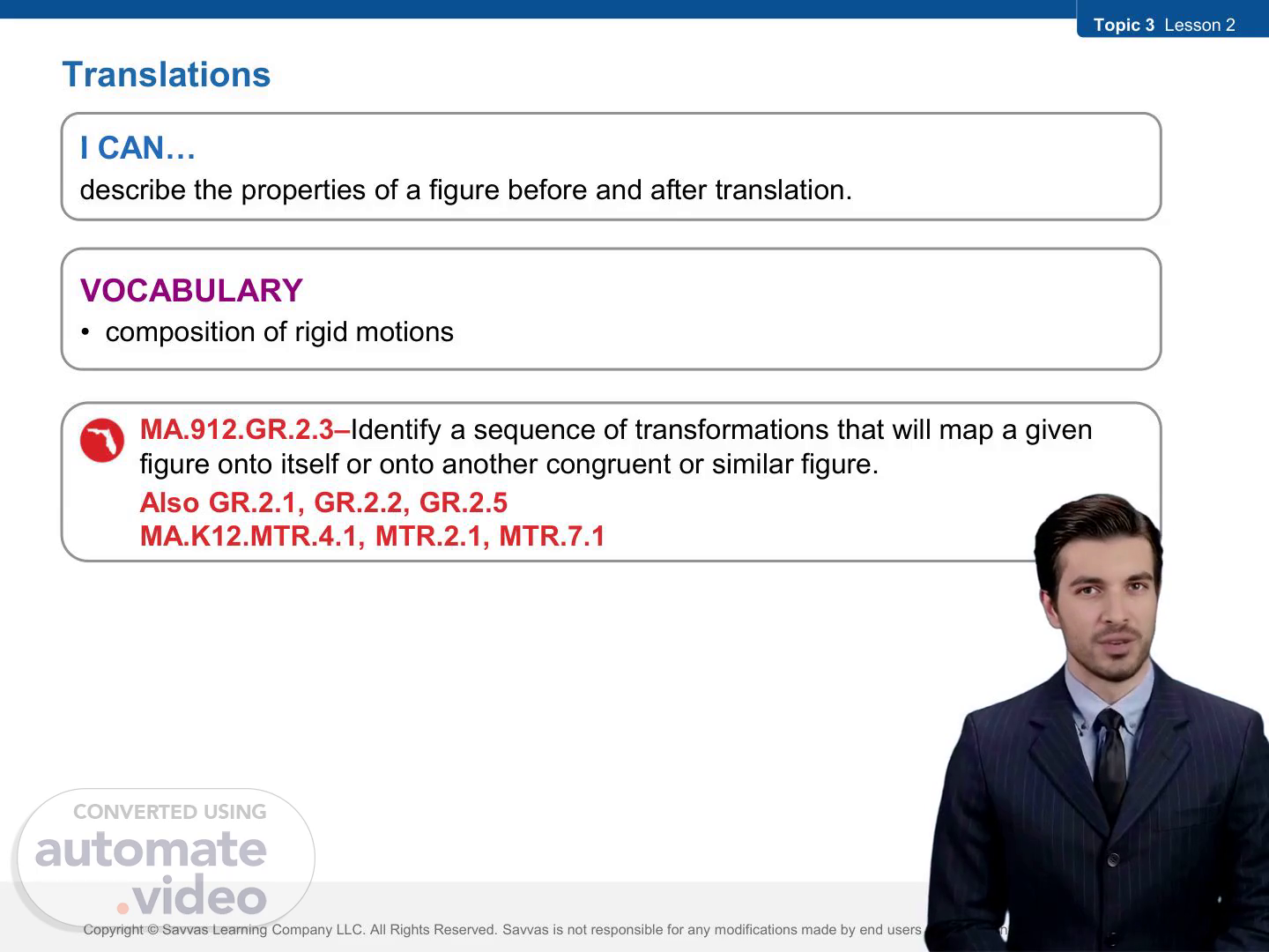 [Virtual Presenter] A translation is a type of transformation that involves moving every point of a figure the same distance and direction. The size and shape of the figure remain unchanged during this process. In essence, a translation preserves the length and angle measures of a figure. For example, if we translate a triangle by two units along the x-axis, it will retain its original angles and side lengths. Similarly, if we translate a rectangle by three units along the y-axis, it retains its original area and perimeter. These characteristics define what makes a translation a rigid motion. Translations involve moving a figure from one location to another while keeping its size and shape intact. They are essential for identifying sequences of transformations that map a figure onto itself or onto another congruent or similar figure. Understanding the properties of translations enables us to analyze and apply transformations in various contexts..