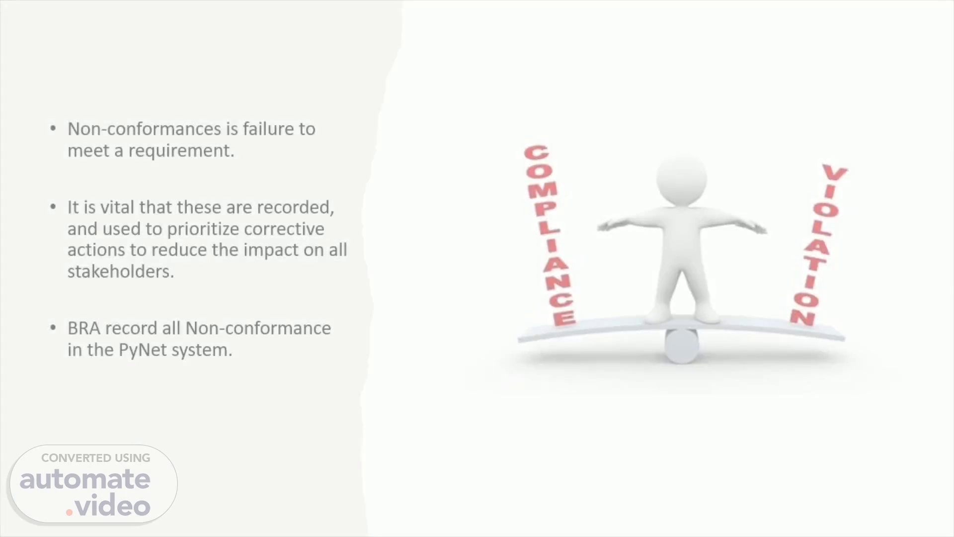 [Audio] Let's discuss about the Non-conformance Procedure first Non-conformances is failure to meet a requirement. It is important to record the Non-conformance and used to prioritize corrective actions to reduce the impact on all stakeholders. BRA record all Non-conformance in the PyNet system, and I will explain further regarding recording Non-conformance in a later slide..