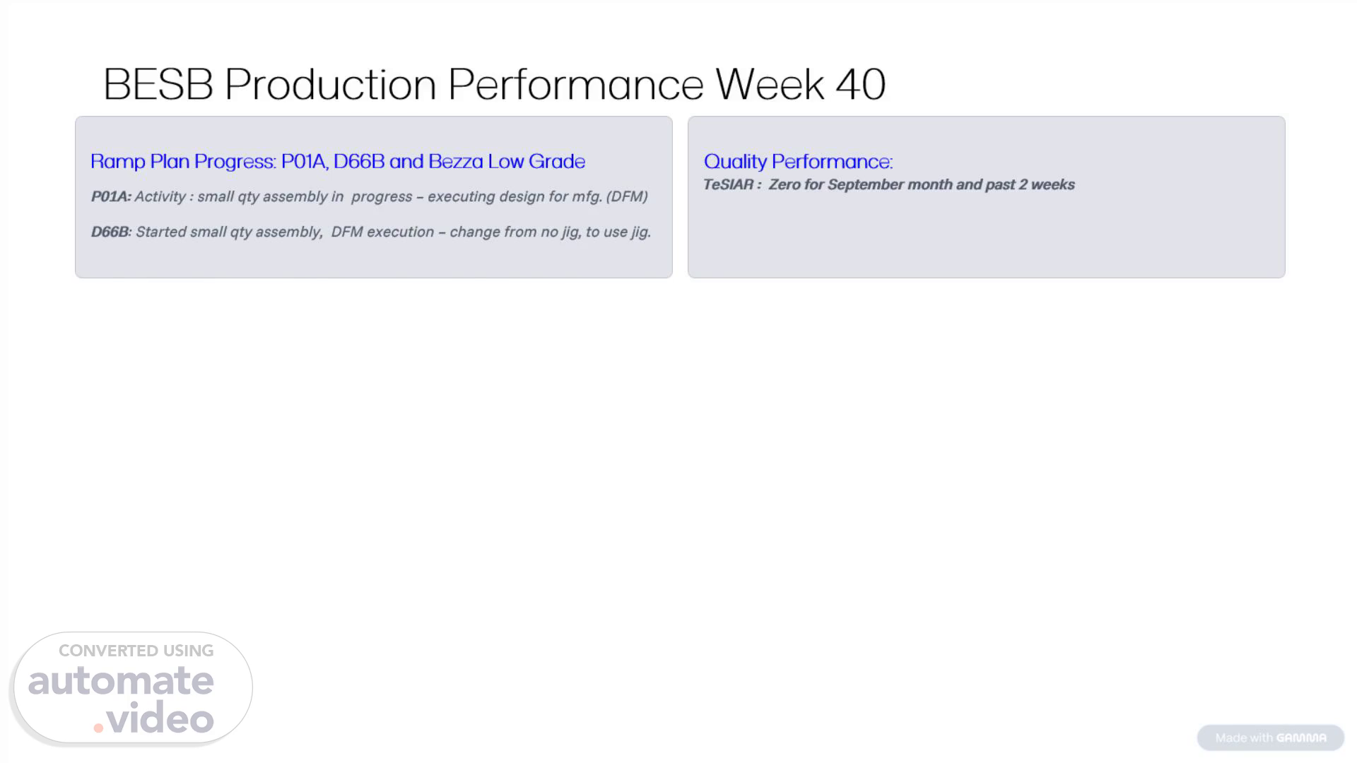 [Audio] BESB Production Performance Week 40 Ramp Plan Progress: P01A, D66B and Bezza Low Grade Quality Performance: TeSIAR : Zero for September month and past 2 weeks P01A: Activity : small qty assembly in progress – executing design for mfg. (DFM) D66B: Started small qty assembly, DFM execution – change from no jig, to use jig. Dedicate team to focus on quality execution, Perodua visited the line and passed. Yield Performance OEE Performance Exceeding 90% target across all lines: Outstanding yield performance across production stages: SMT Line 1& 2 average : 96% vs target 90% SMT Yield: 95% (target: 90%) Final Assembly Lines : 90% vs target 90% Final Assembly: 97.5% (target: 95%) Delivery Excellence Cost Management Maintenance expenses well within budget: Delivery performance: Audio: 100%, Month to Date Qty shipped 1488 units (as of 2 October) MTD: RM2,470 (Budget: RM20K) Heacon: 100%, Month to Date, Qty shipped 1552 units shipped Perodua: Power Socket for Perodua, En Mazni glad that Betamek is working on further cost down for customer satisfaction Good afternoon, For Production Update Highlight the strong performance of BESB production this week, with zero quality issues, high yields meeting above targets, and 100% delivery for Audio of 1488 units and Heacon of 1552 units to customer Perodua. Team has started the assembly build for P01A of 9 parts and D66B new SUV infotainment small volume in phases for the delivery in end Nov2025. Design for Manufacturing tool is being used daily for all the process steps enhancement from the R&D stage to actual production eliminating mistakes, using po ka yo ke approach and kaizen approach systematically. Quality first mind set is part of production zero defect initiatives. Team also has successfully conduct trial for night shift with small crew of 8 person running SMT without any issues. Perodua has visited on the new line for D66B and has given a nod that the line is ready and passed the audit. On another note, En Mazni of GM, Perodua PVM, glad that we continue to work on cost down for the power socket..